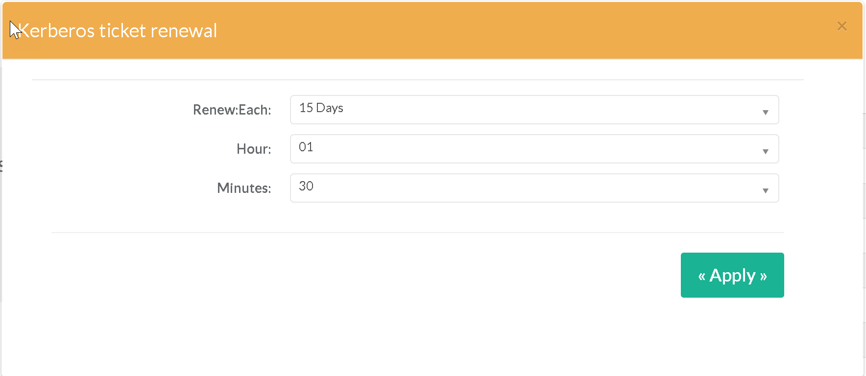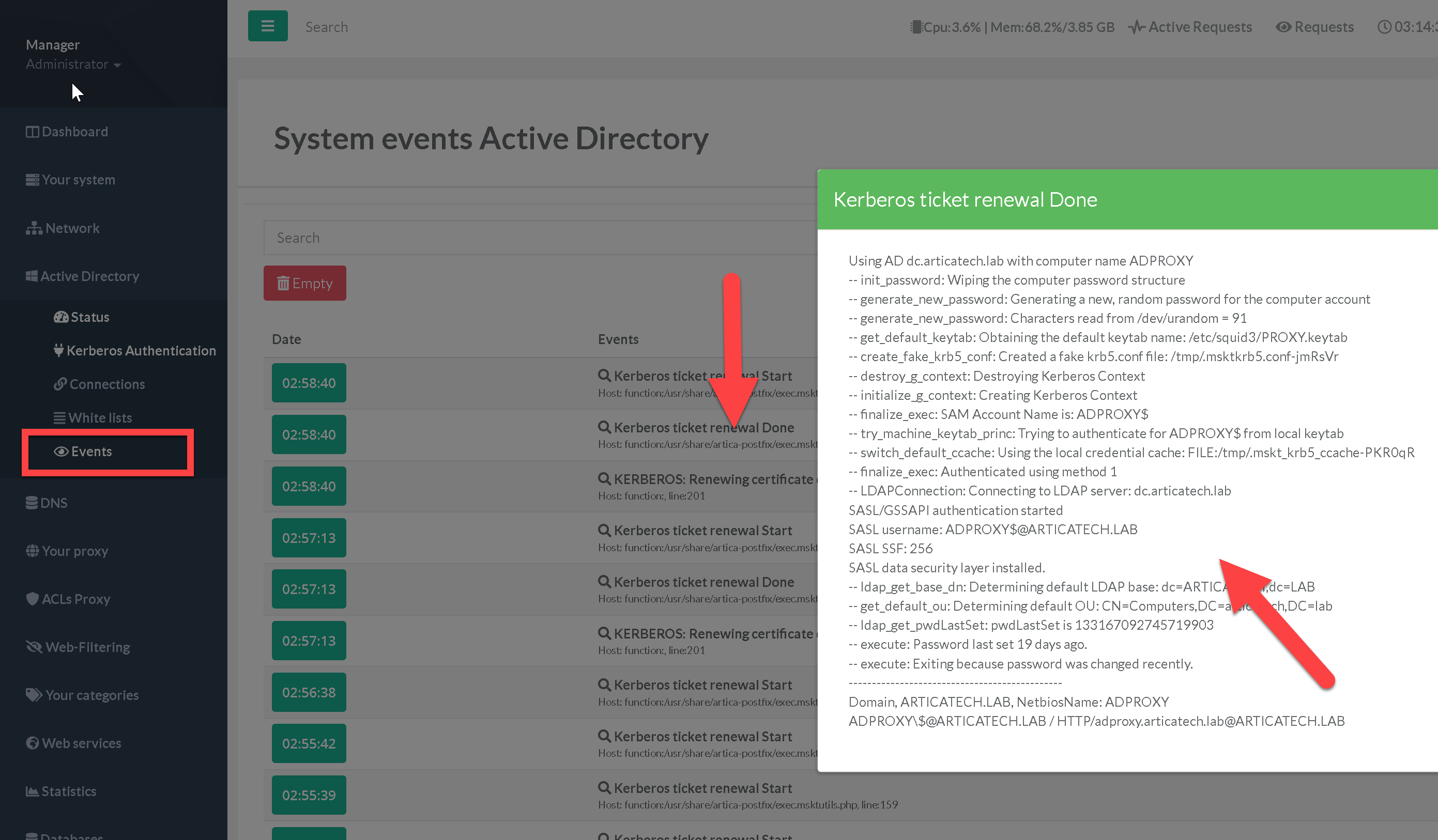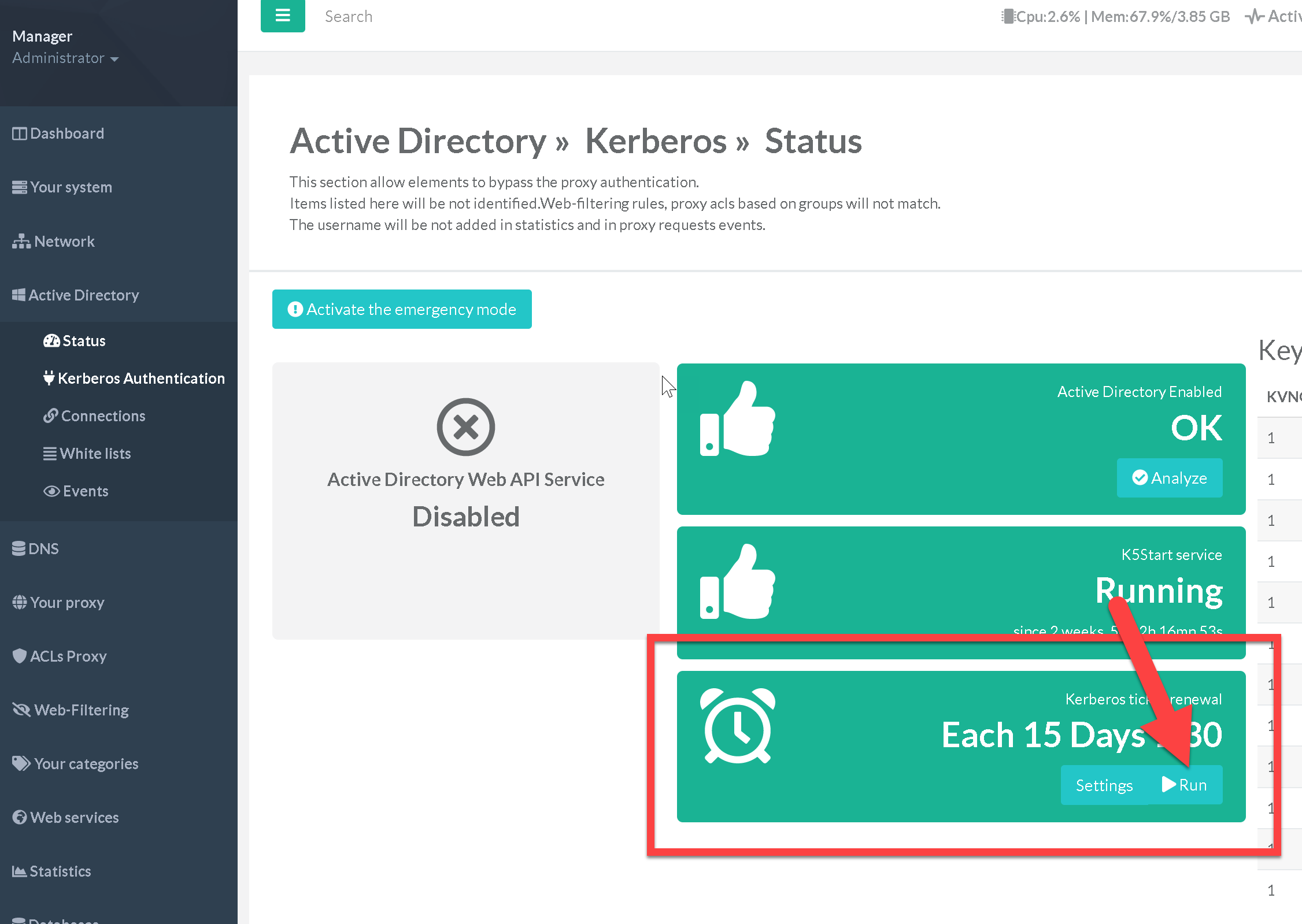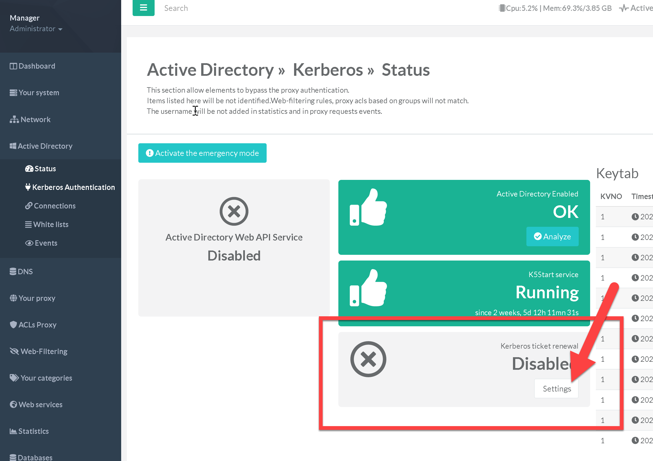 Active Directory > Status a widget displays the state of the Kerberos ticket renewal task.