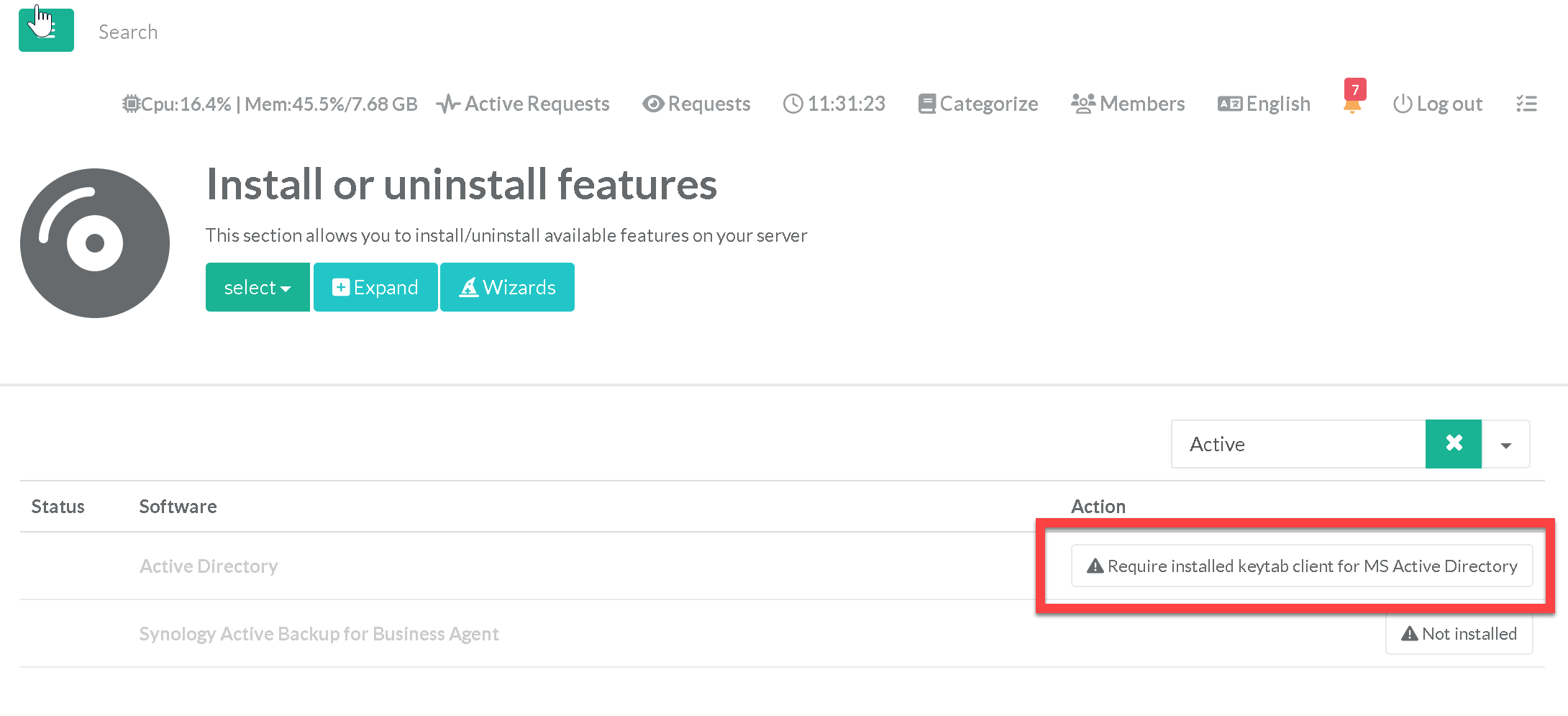 If you have installed the Artica manually, and you have selected the light installation, you will see a missing keytab client for MS Active Directory in the features section.