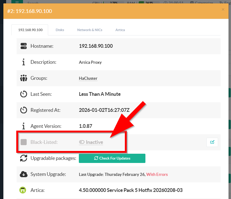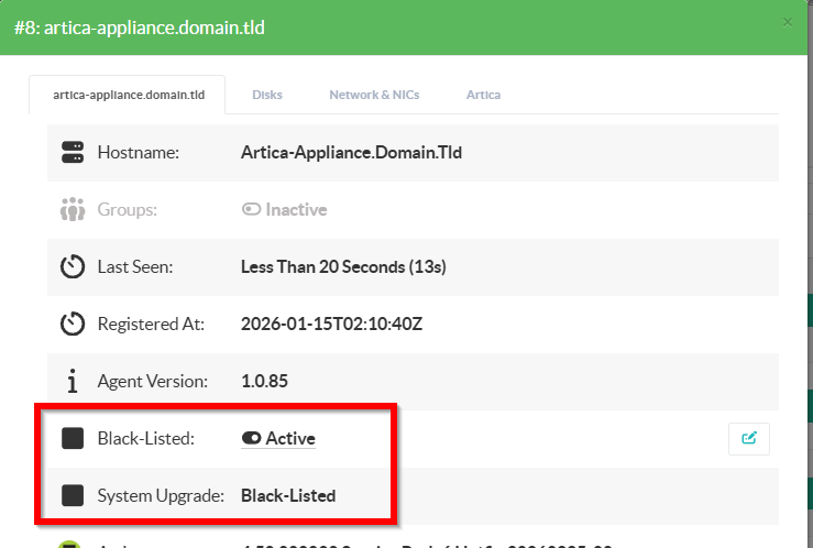 The blacklist is a soft deny mechanism that prevents Artica software packages from being pushed to a specific agent node, while leaving all monitoring, operational, and binary upgrade capabilities intact.