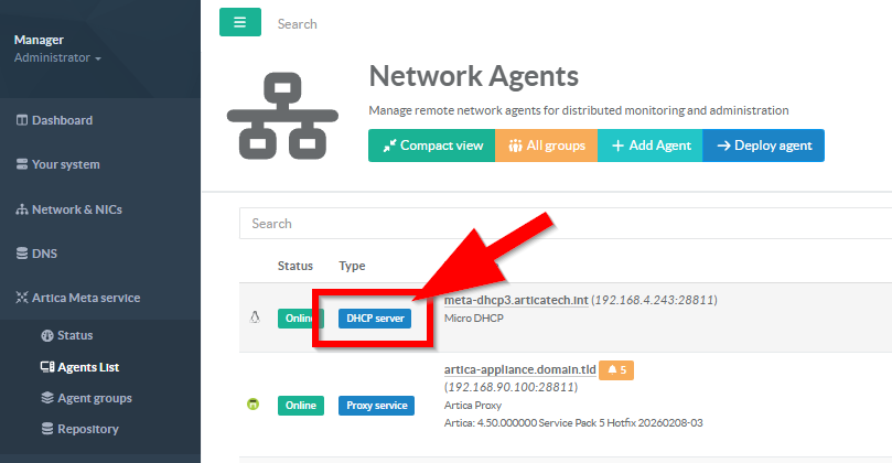 From the main Network Agents table, click on the DHCP server label