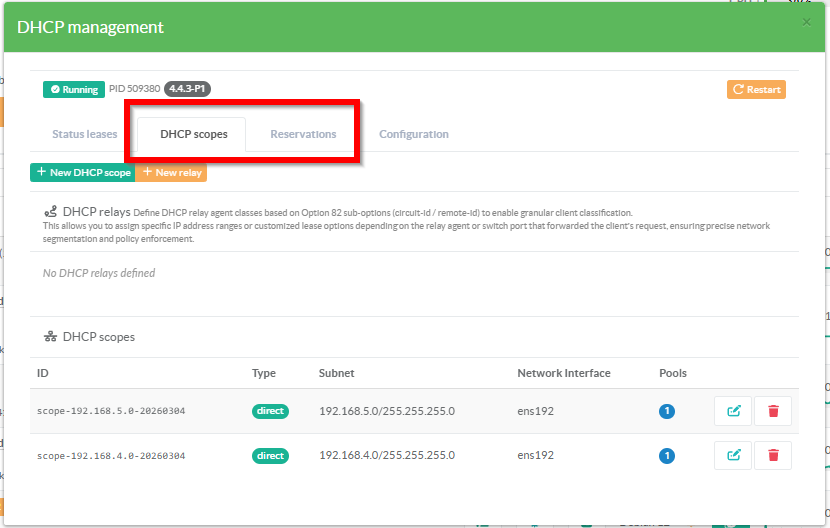 Through the configuration interface, define your DHCP settings (scopes, reservations, and DHCP relay agents).