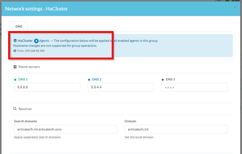The system will load the DNS configuration of the first node in the group as a reference. Since group settings must remain consistent, all nodes will share the same configuration.