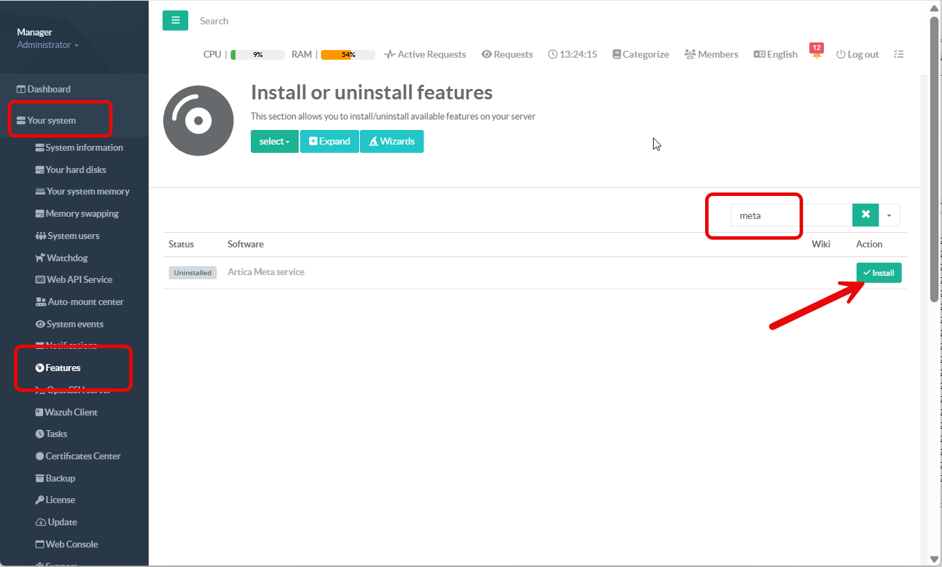 The installation of Artica Meta is performed via the Features section; it simply consists of enabling a feature.