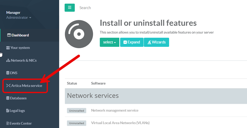 Once installed, you will see “Artica Meta service” on the left menu