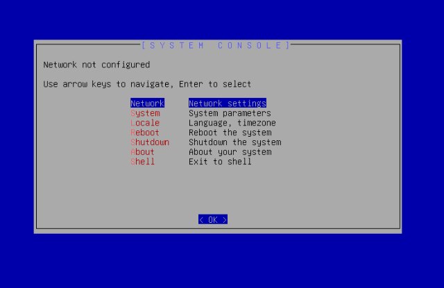 - After the end of installation, the system will be rebooted the menu console is now displayed.
