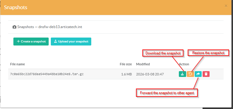 In the Artica context, a snapshot is a package that allows saving and restoring all the settings managed by an Artica server.