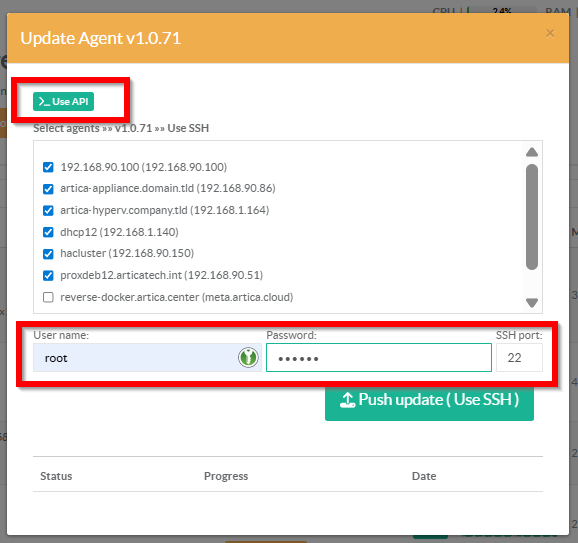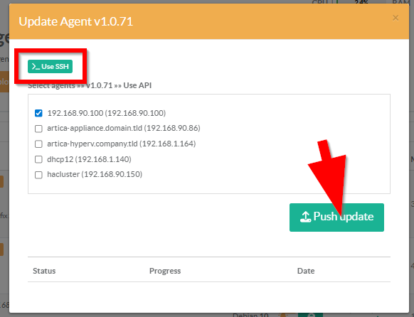If some agents are unavailable (service stopped), you can carry out the update using the SSH protocol.