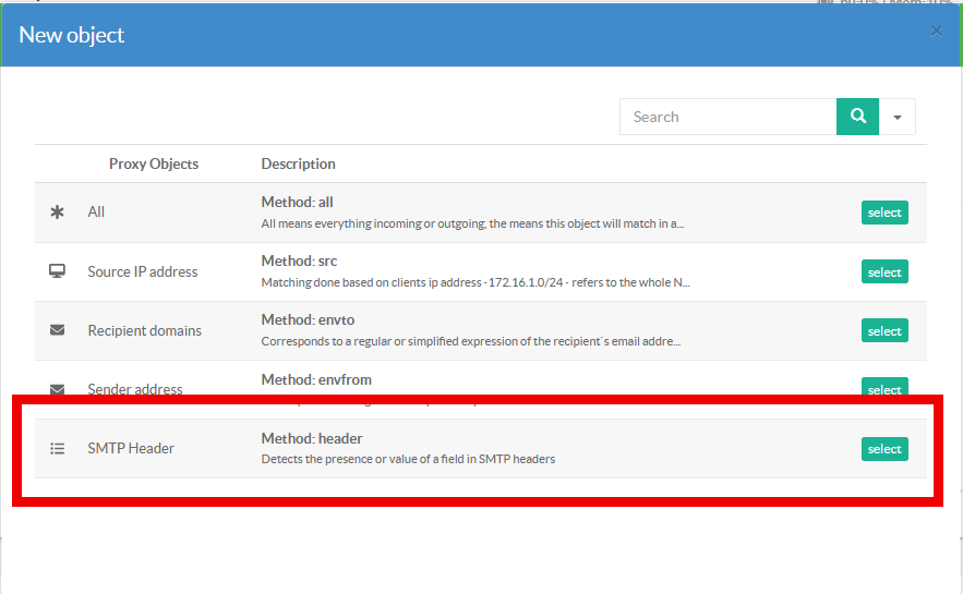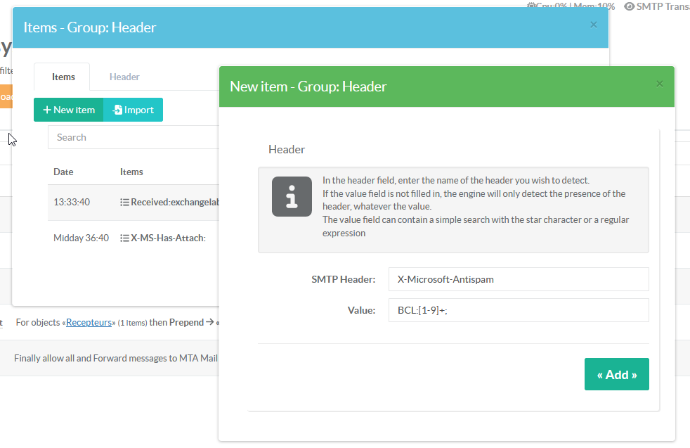This object detects the presence or a value in SMTP header fields, enabling you to fine-tune your rules according to the elements contained in SMTP headers.