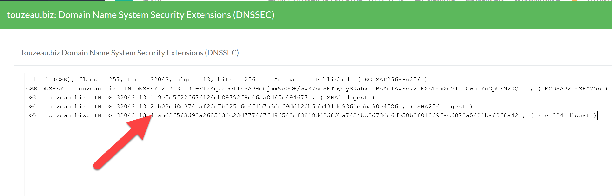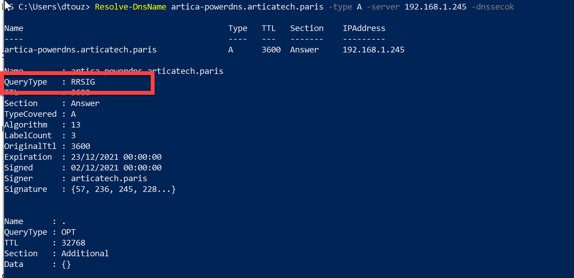 In our example the articatech.paris zone is signed, an RRSIG resource record was included with the DNS response