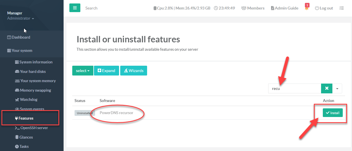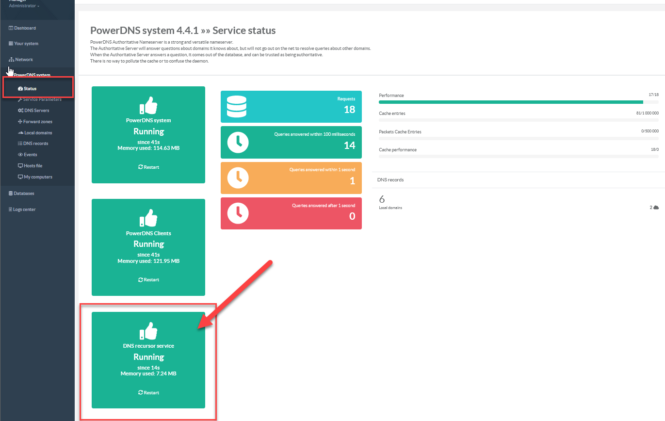 - Under the left menu “PowerDNS system / Status”, you should see a new status “DNS Recursor service”