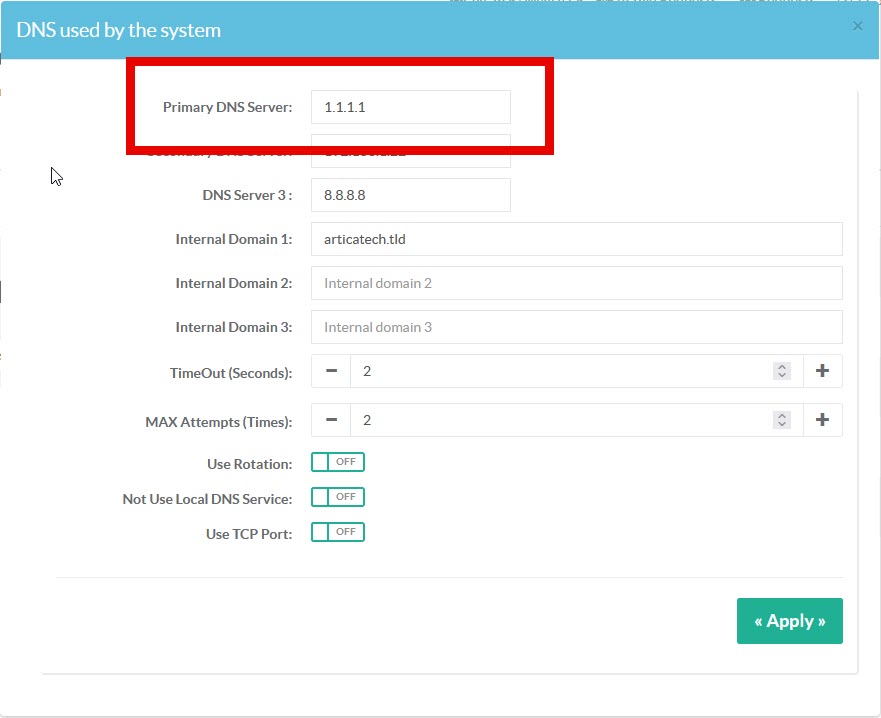 “1.1.1.1”, ( Entering this value enables the Cloudflare's DNS over HTTPs Proxy Client service )