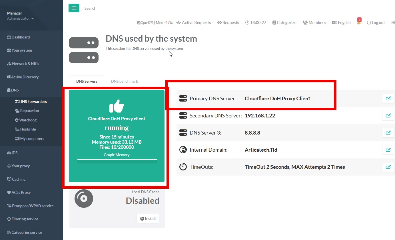 Cloudflare is known for its extensive global network, which can help reduce latency in DNS resolutions. By using cloudflared to handle DNS queries, users might experience faster response times from DNS lookups, which can contribute to overall quicker internet access.This feature is available with Artiva v4.50 Service Pack 1 or Artica v4.50 Hotfix 20240508-19