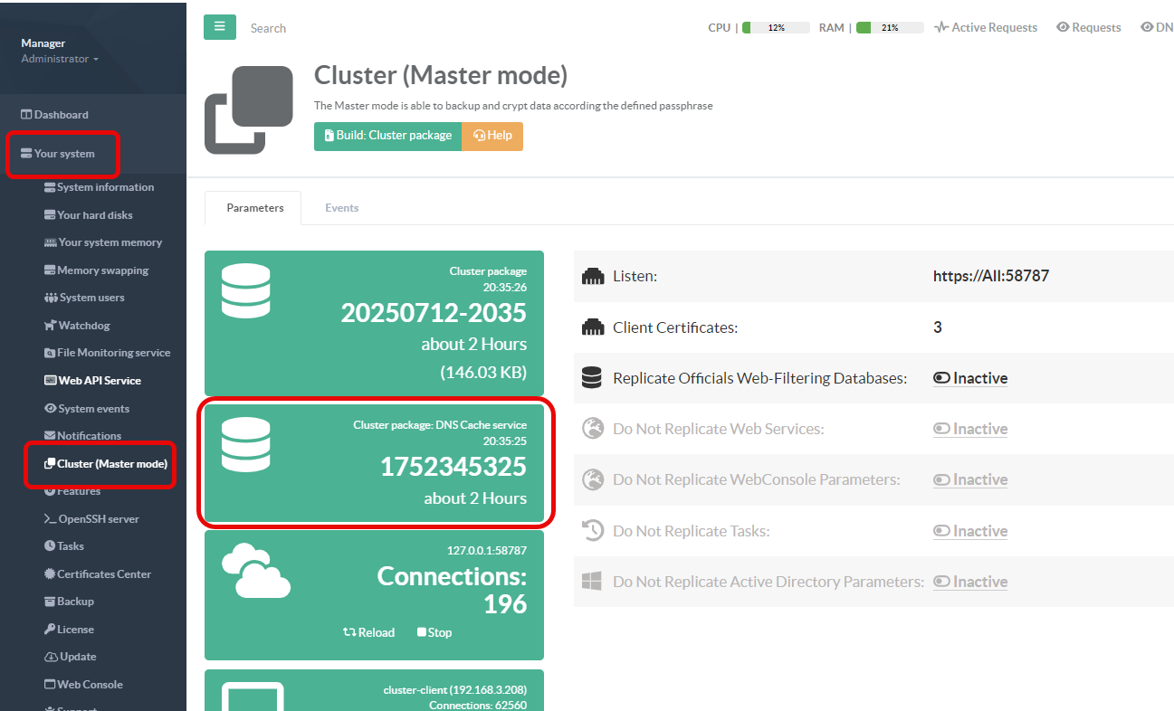 When you modify a setting or a DNS cache record, or something else on the master cluster, it prepares a dedicated cluster package for the DNS system.
