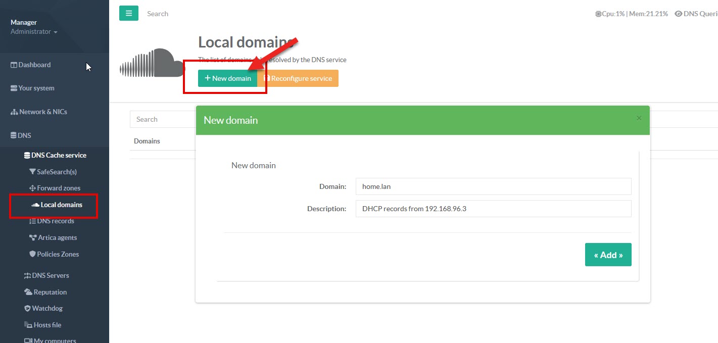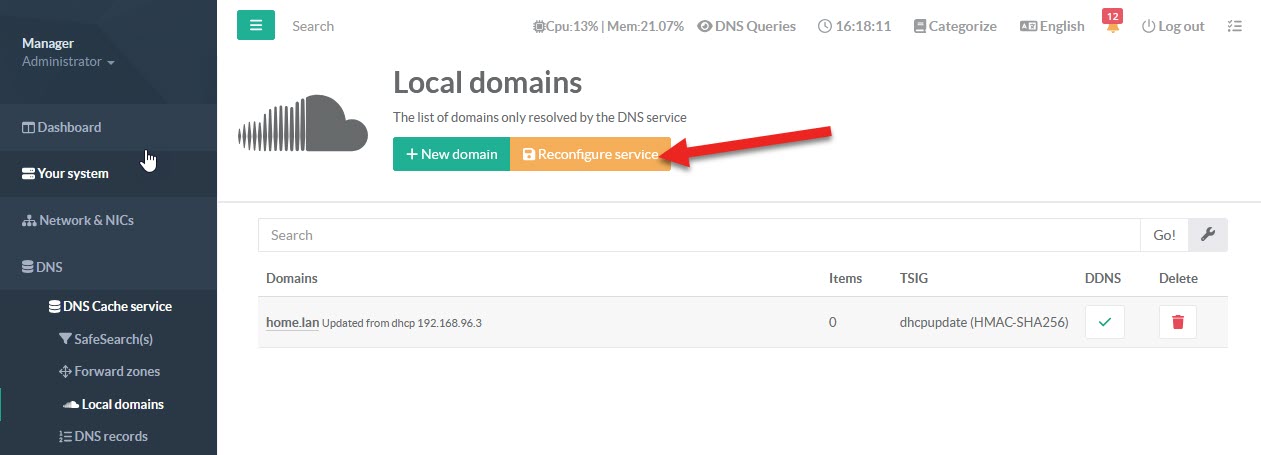 To do this, you need to add local domains. These local domains will tell your DNS service that it can receive updates from your DHCP server. On the left menu, go to DNS > DNS Cache service > local domains