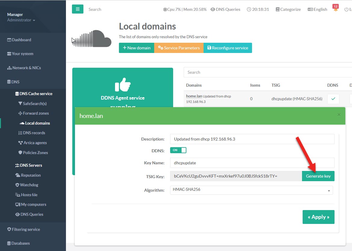 You need to install first the DDNS Agent Service If you use the DNS Cache service on the same Artica server as the Kea DHCP service, dynamic records updates are automatically enabled.