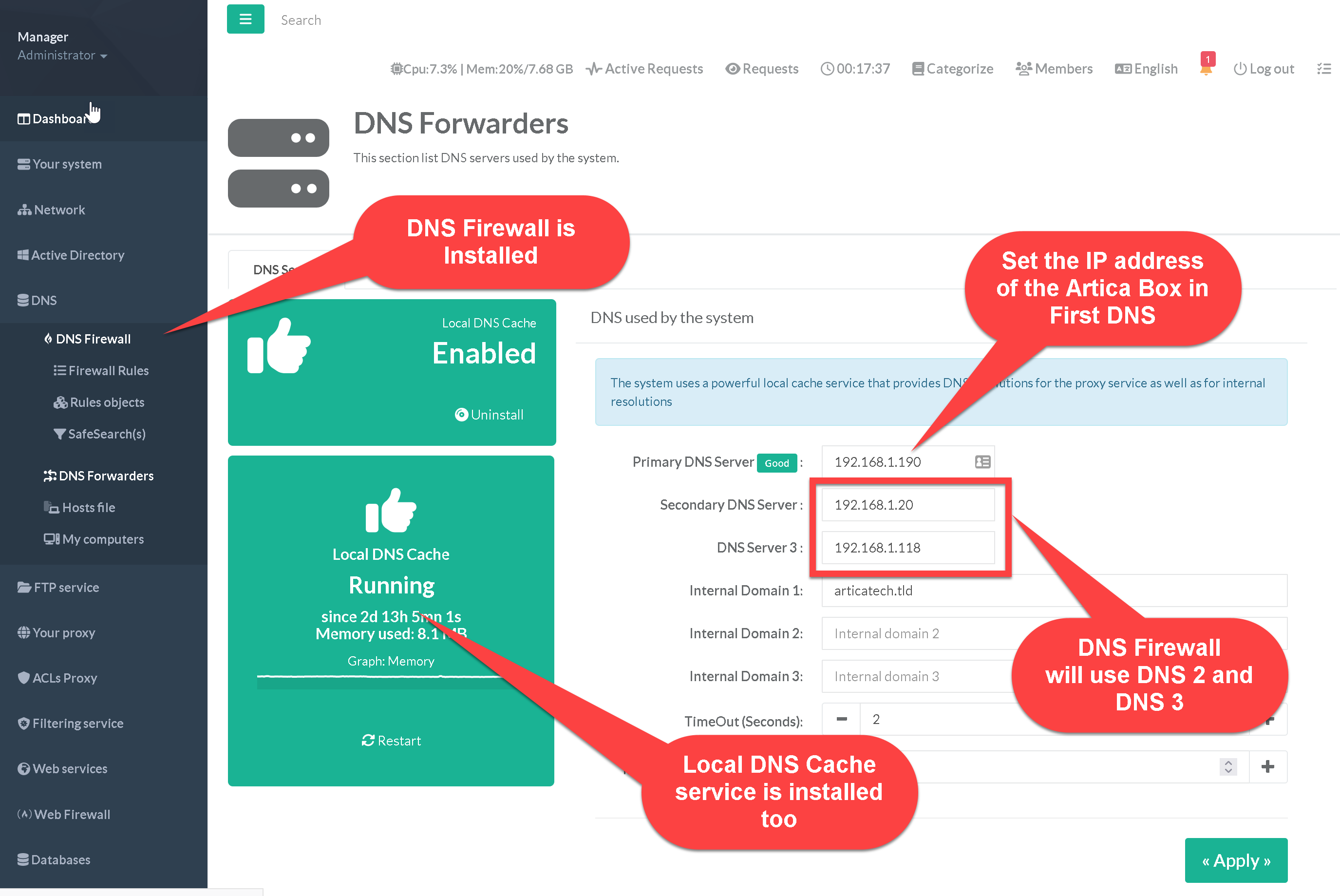On DNS Forwarders, where the local DNS cache is, use the first DNS field and put the IP address of the Artica Box ( not 127.0.0.1 ). For example, if your Artica server is 192.168.1.190, your local DNS Cache wil use the 192.168.1.190 to query domains and your DNS Firewall will use the DNS 2 and DNS 3 to forward queries.