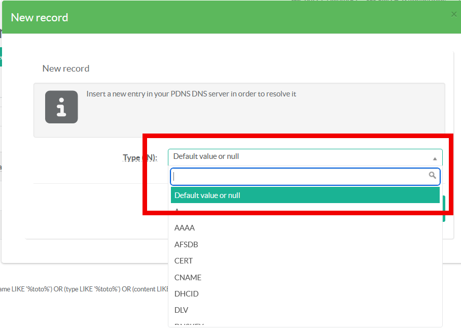 Select the type of record, valid options are A, AAAA, AFSDB, CERT, CNAME, DHCID, DLV, DNSKEY, DS, EUI48, EUI64, HINFO, IPSECKEY, KEY, KX, LOC, MINFO, MR, MX, NAPTR, NS, NSEC, NSEC3, NSEC3PARAM, OPT, PTR, RKEY, RP, RRSIG, SIG, SOA, SPF, SRV, SSHFP, TLSA, TSIG, TXT, WKS, A, AAAA, AFSDB, CERT, CNAME, DHCID, DLV, DNSKEY, DS, EUI48, EUI64, HINFO, IPSECKEY, KEY, KX, LOC, MINFO, MR, MX, NAPTR, NS, NSEC, NSEC3, NSEC3PARAM, OPT, PTR, RKEY, RP, RRSIG, SIG, SOA, SPF, SRV, SSHFP, TLSA, TSIG, TXT, WKS,