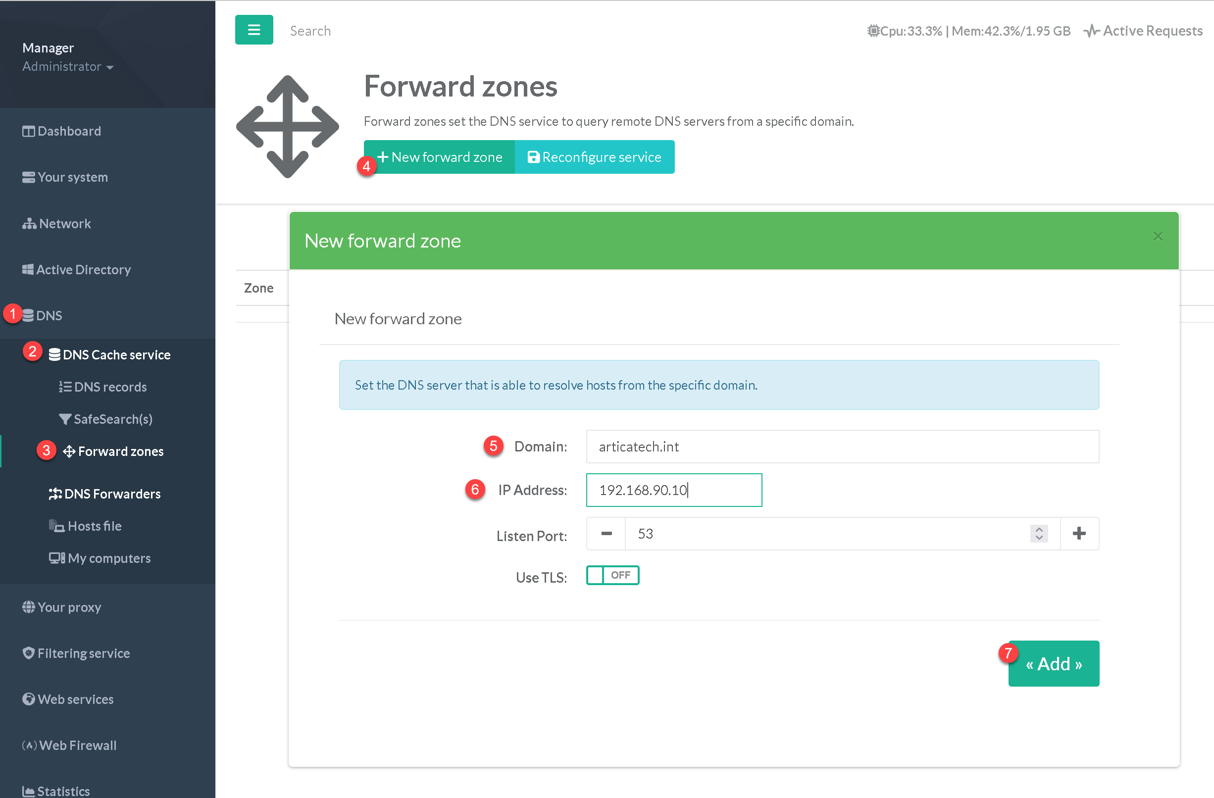 Forward zones are located using the left menu “DNS” > “DNS Cache Service” > “Forward zones”