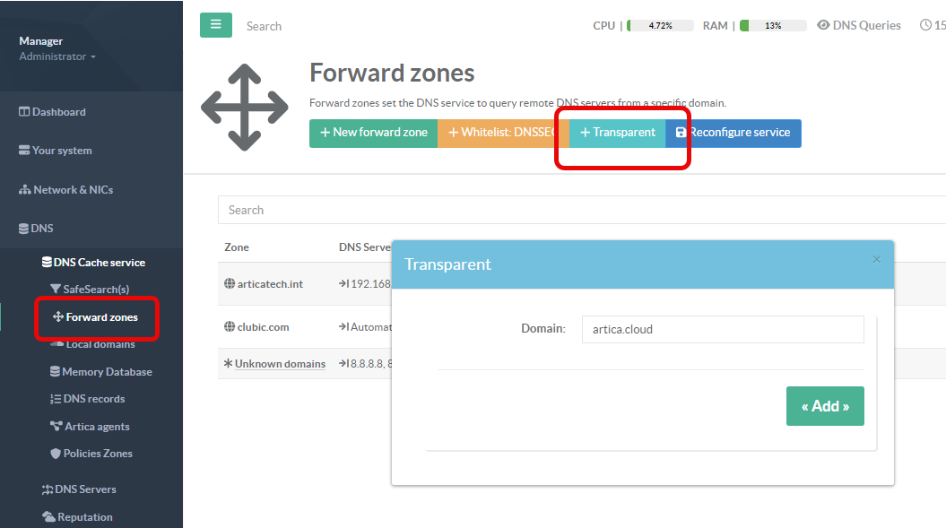The transparent method is used in specific scenarios where you want the DNS service to act as a pass-through resolver for certain domains, forwarding queries to upstream DNS servers without modifying or caching the responses locally.