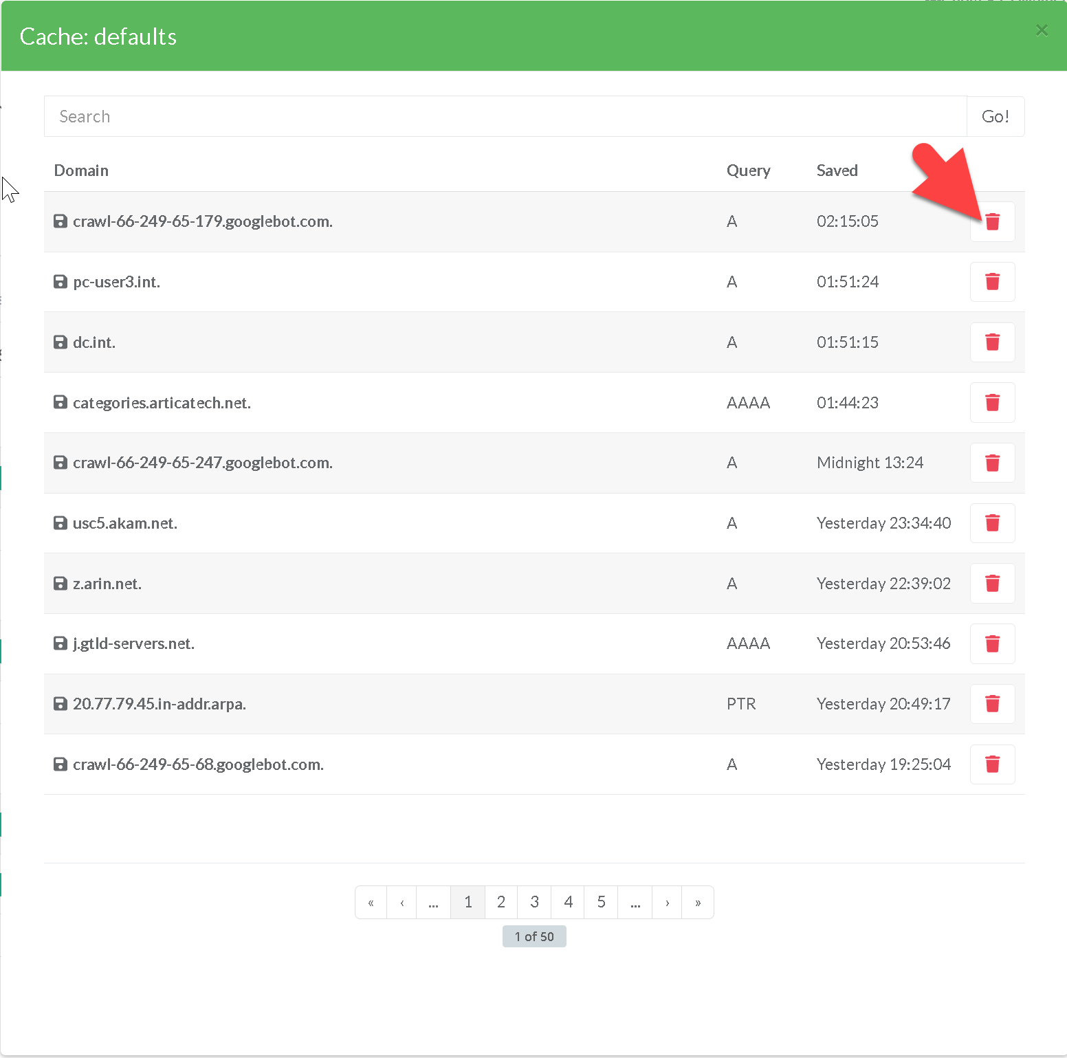 A new section appears listing all the records saved in the memory cache. You can search for them and click on the red trash in order to delete the item from the cache