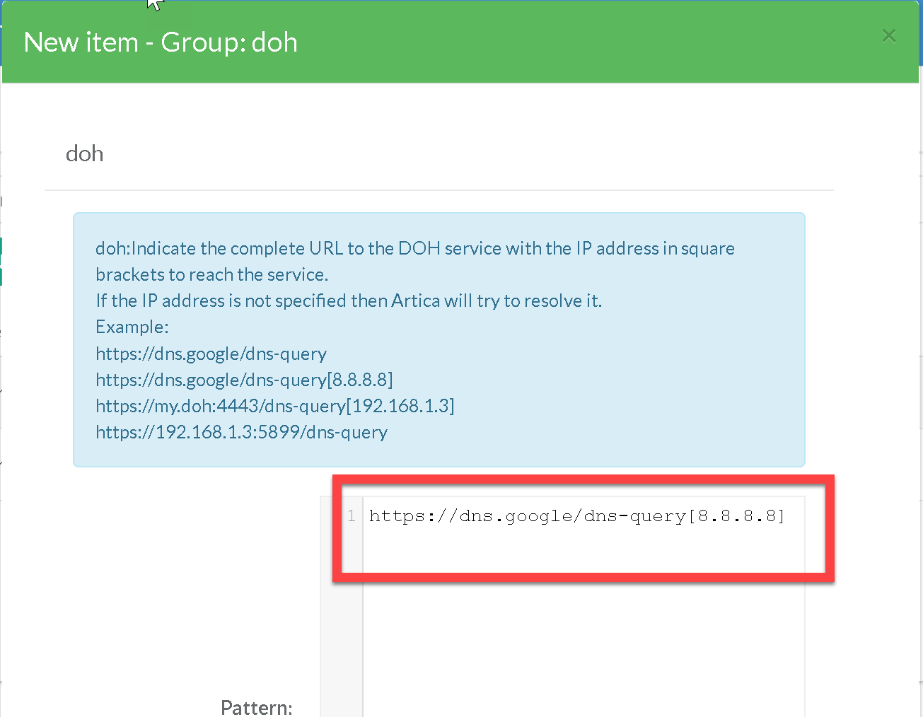 Example:https://dns.google/dns-queryhttps://dns.google/dns-query[8.8.8.8]https://my.doh:4443/dns-query[192.168.1.3]https://192.168.1.3:5899/dns-query