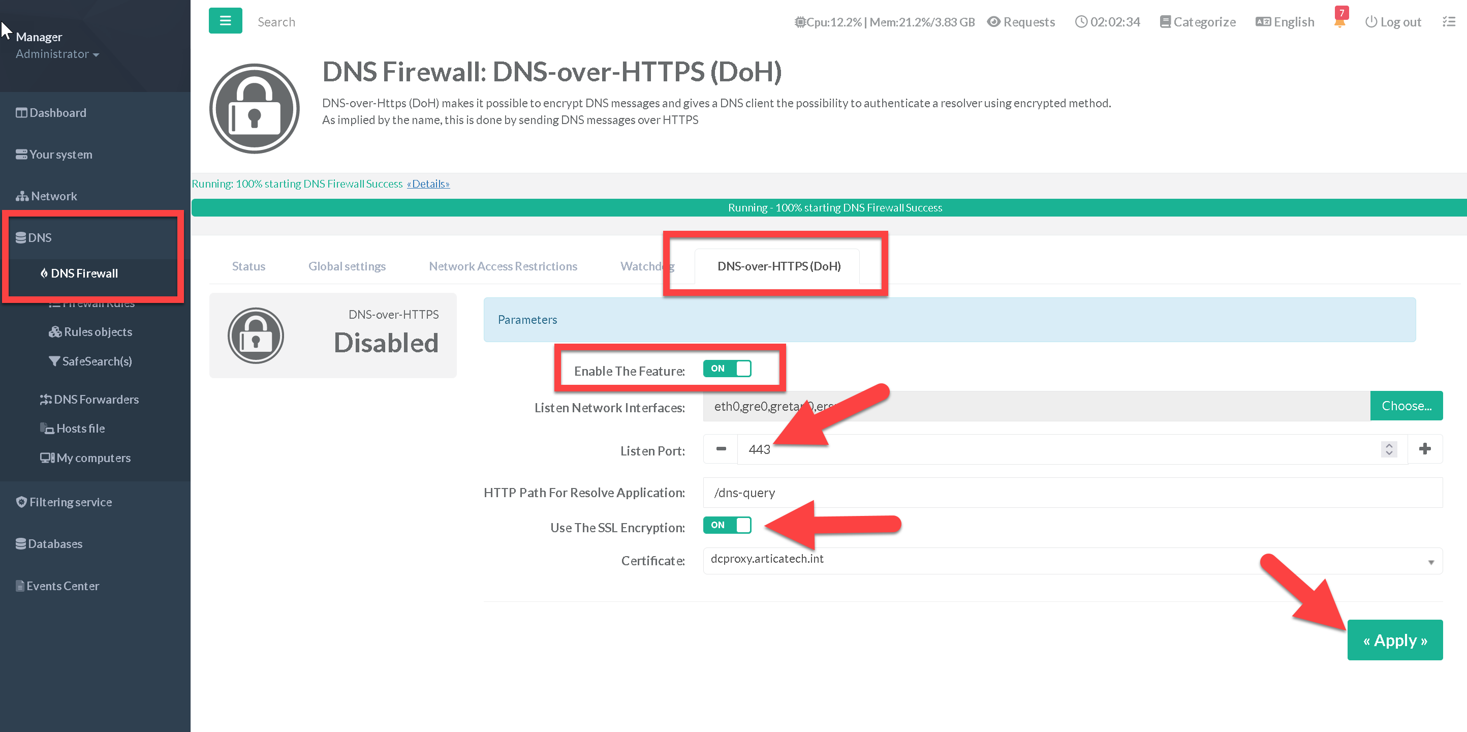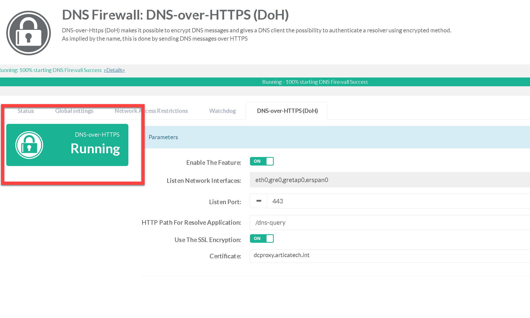 To address these concerns, two DNS privacy standards have gained popularity over the past two years. DNS-over-HTTPS (DoH) provides another form of secure transport where DNS queries and responses are passed as HTTPS traffic. This feature is available in Artica v4.30 with Service Pack Instable 925 or Artica v4.40