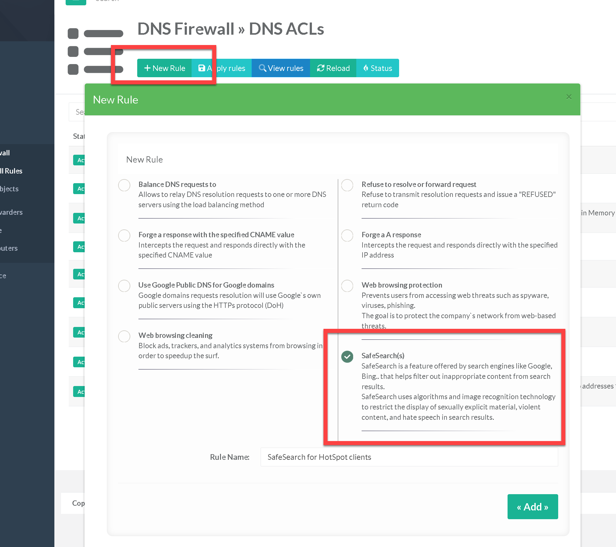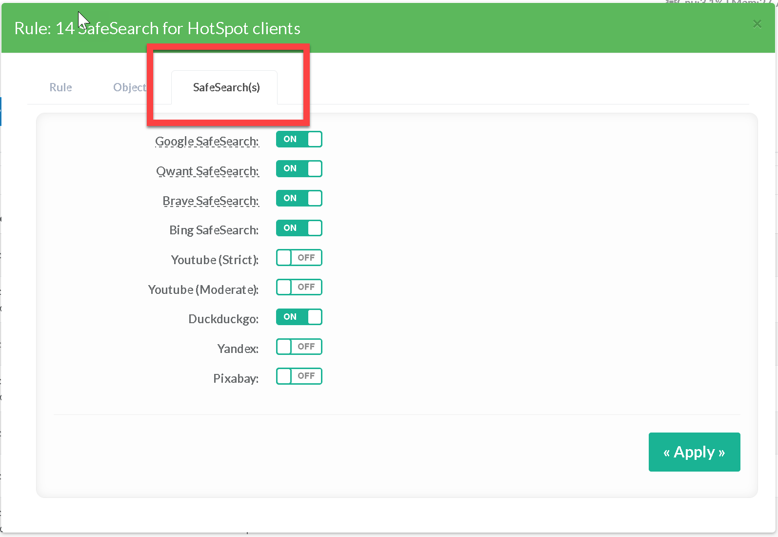 Select the rule and click on the “SafeSearch(s)” tab and turn on or turn off search engines that will be subject to the strengthening of SafeSearch