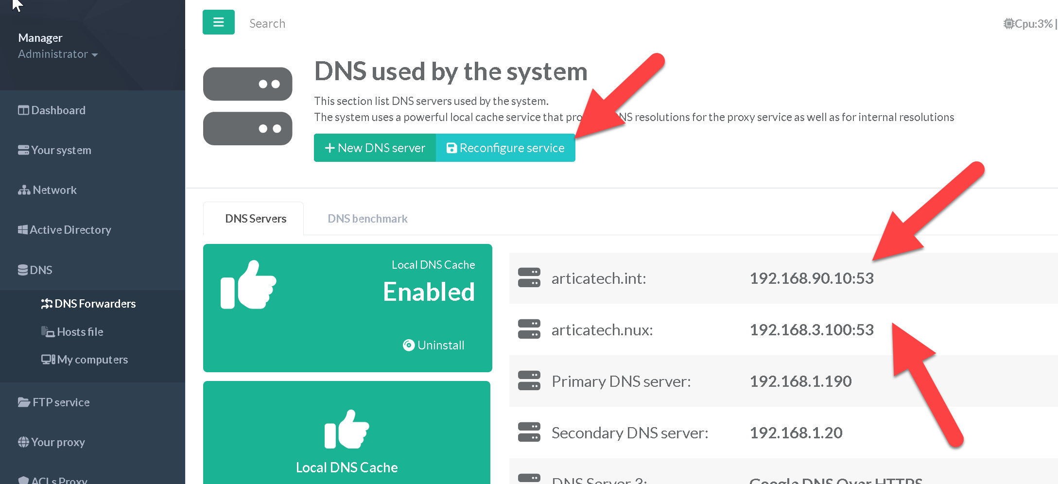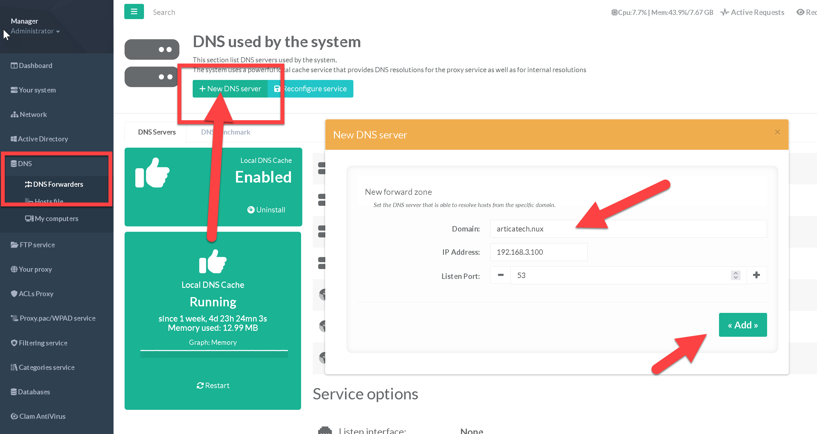 Set the local domain in the “Domain” field and the IP address of the local DNS service.