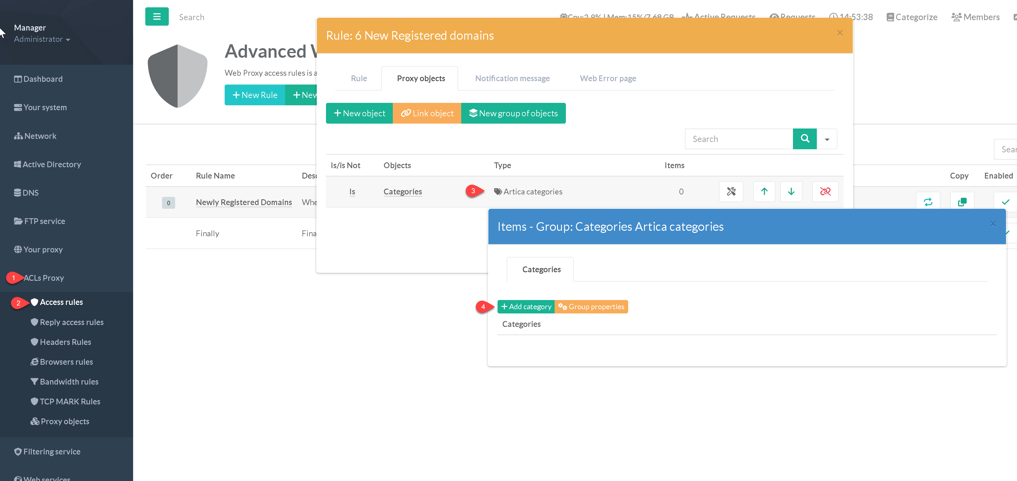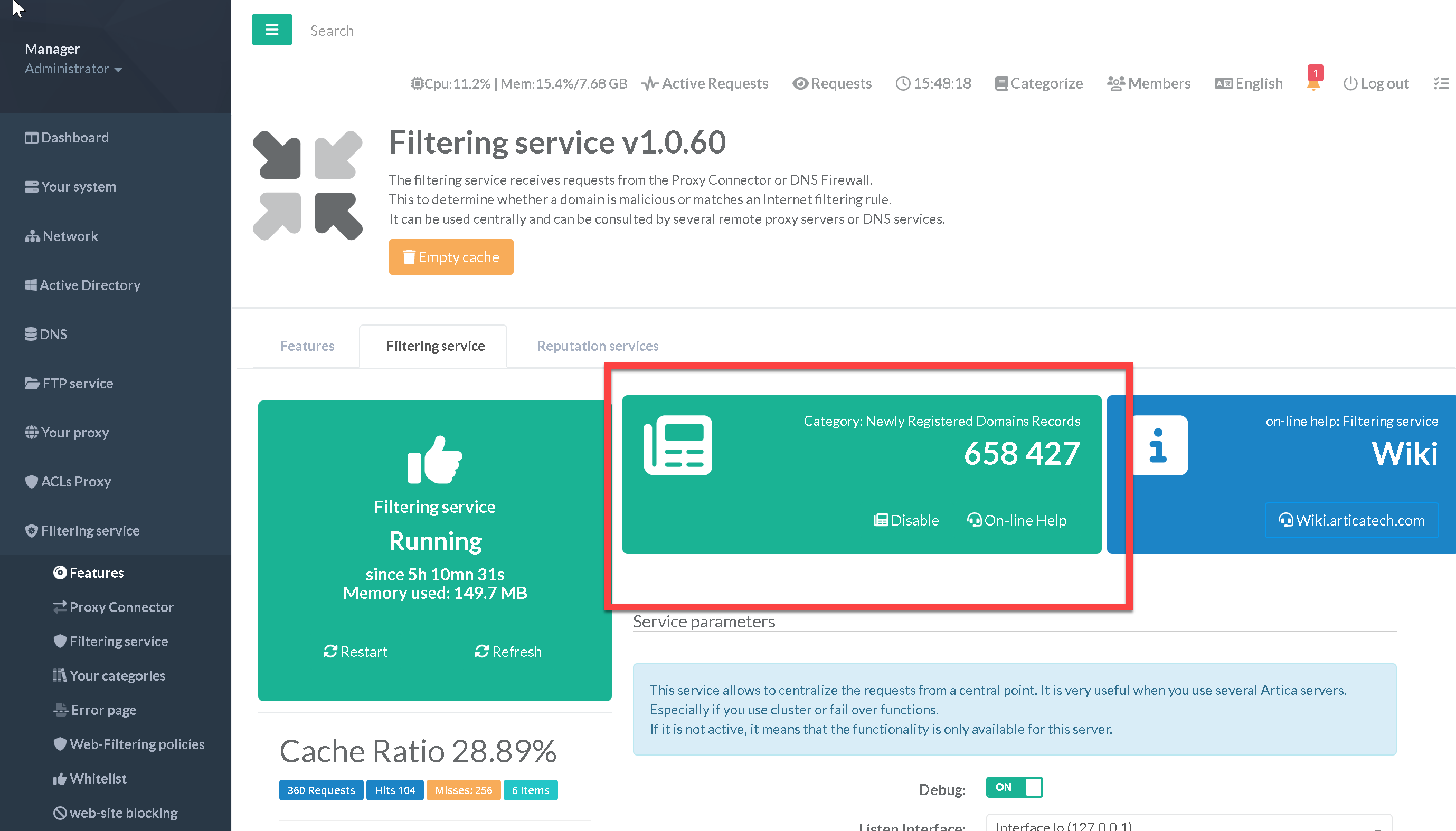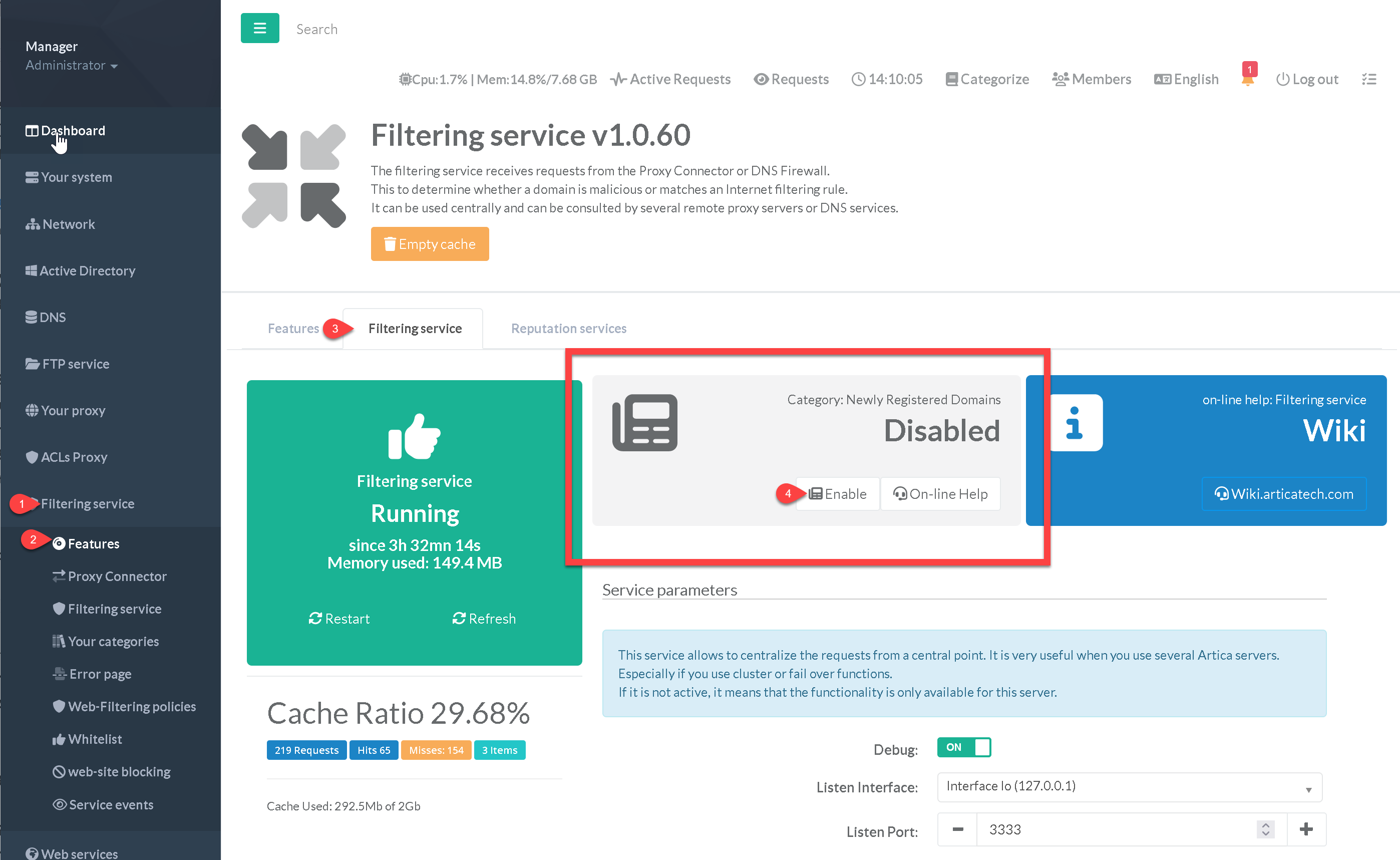 On the Filtering service parameters, click on “Enable” button inside the “Category: Newly Registered Domains” widget