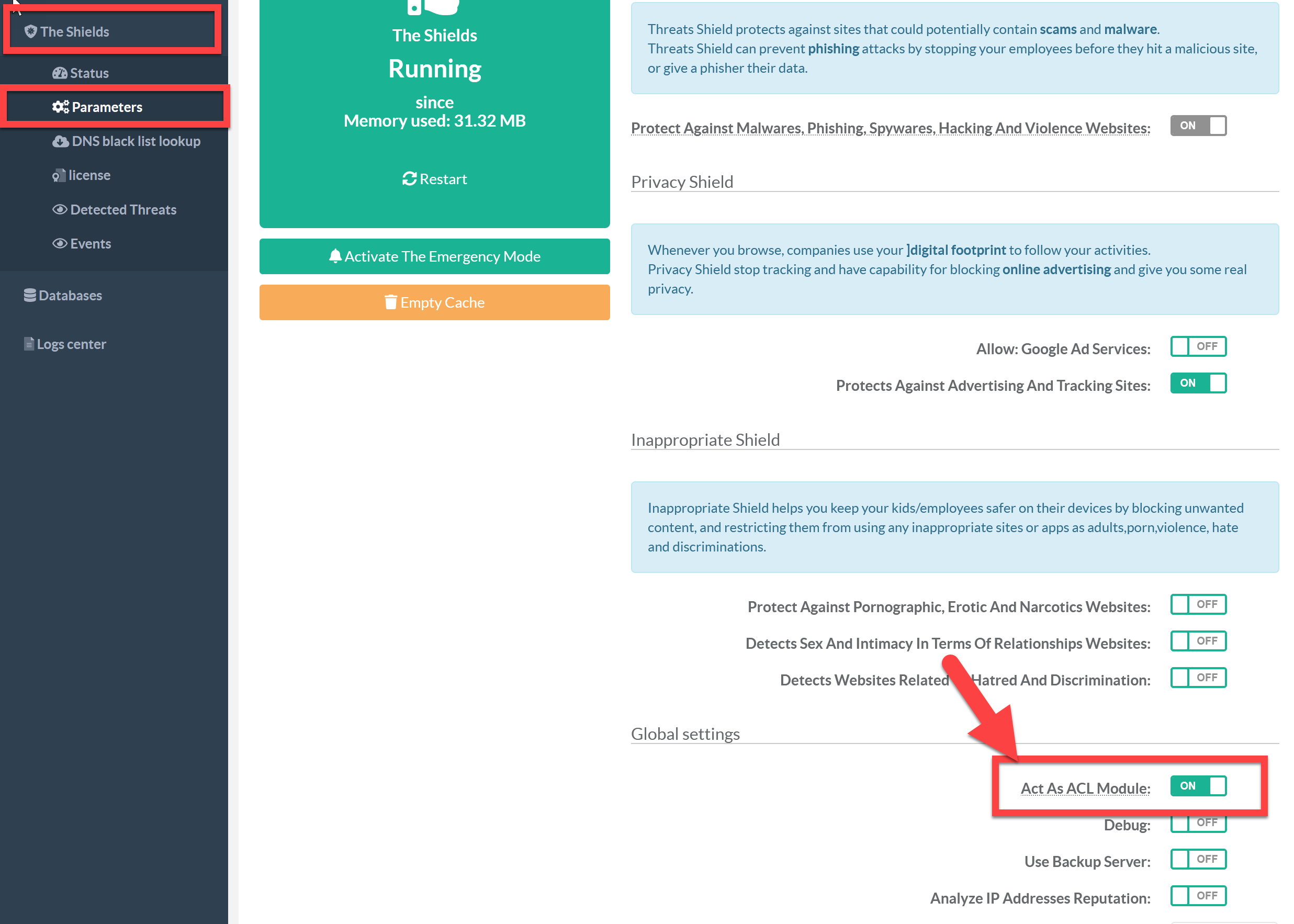 The Shields is a reputation object, by default it is running as a global proxy addon but you can switch it to an ACL object