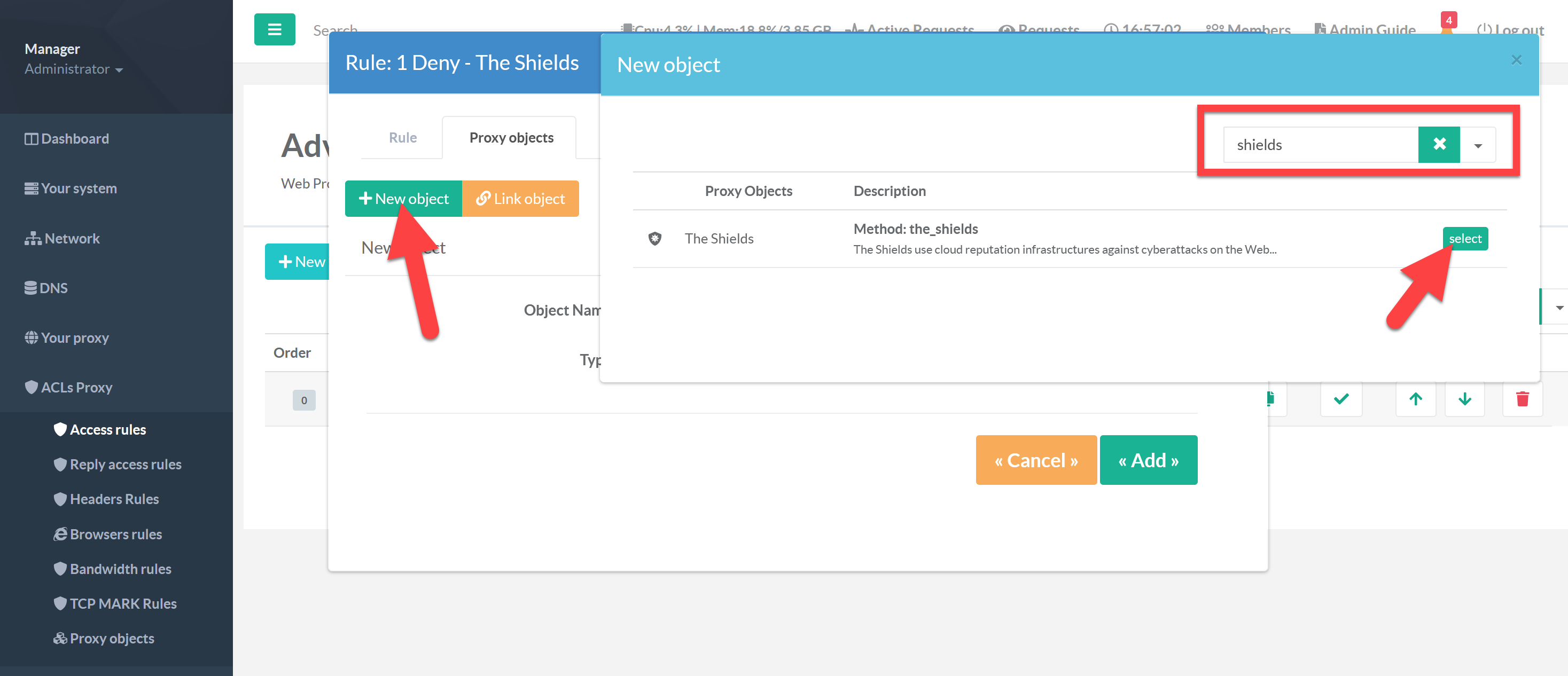- Click on “Select” button in order to include “The Shields” reputation engine inside your ACL rule.