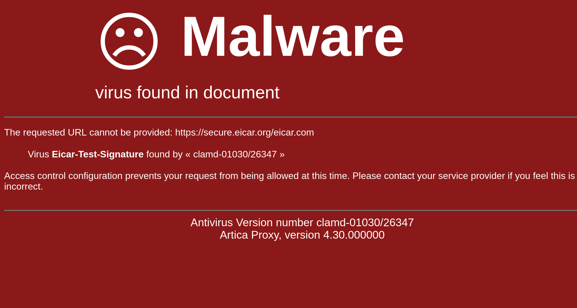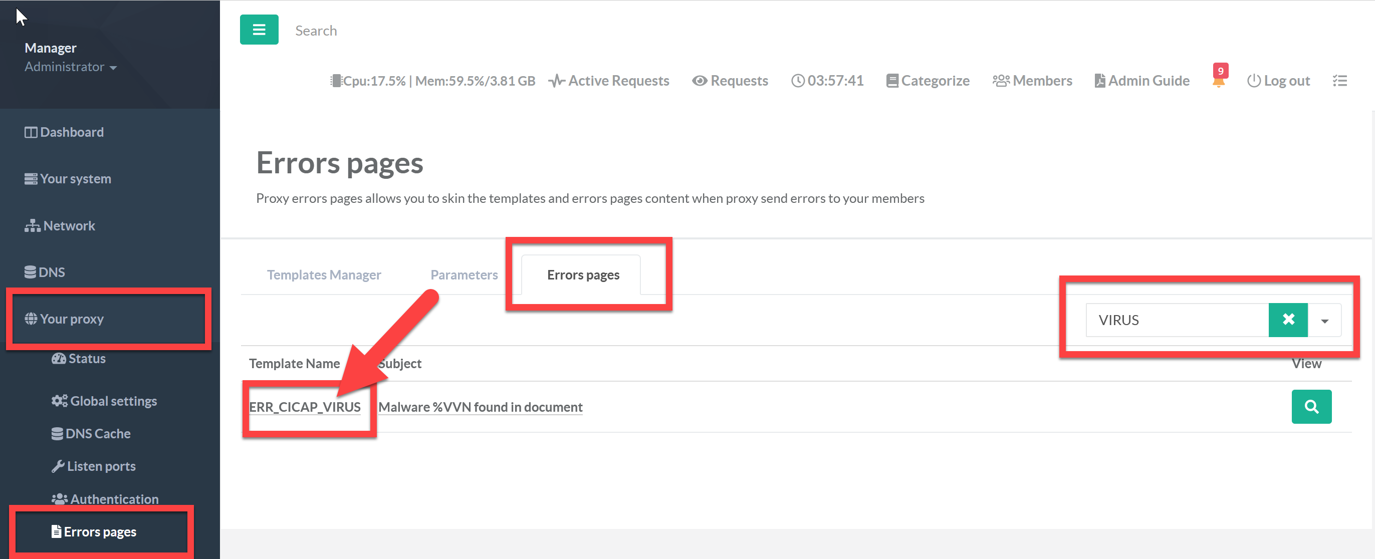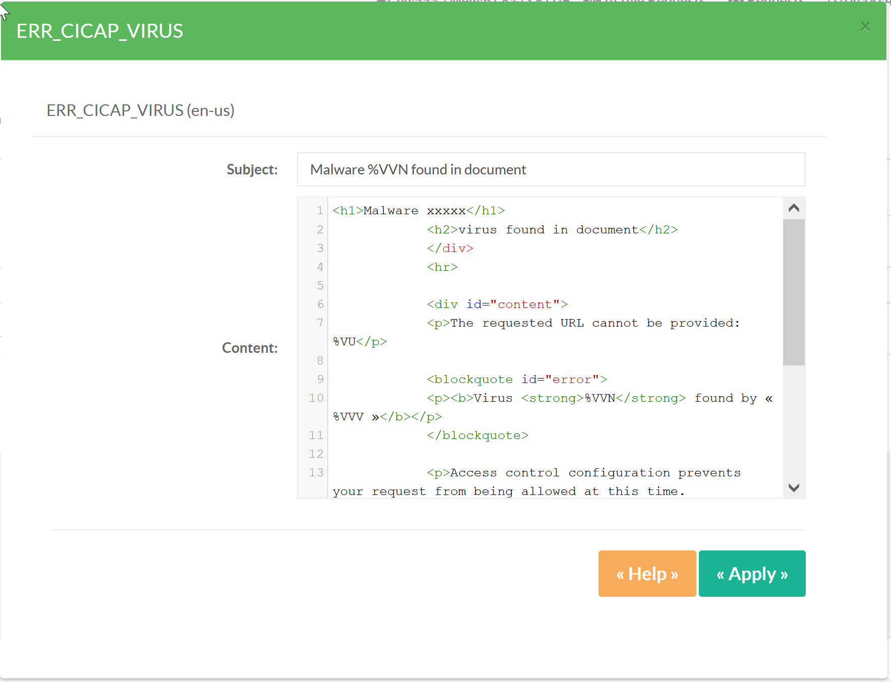When a virus is found, a red error page is generated, to modify it you need to use the Errors pages section.The v4.30 Service Pack 407 fix the issue of unable to extract the template from the main table.