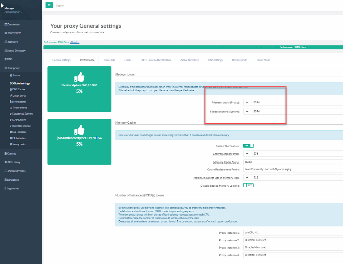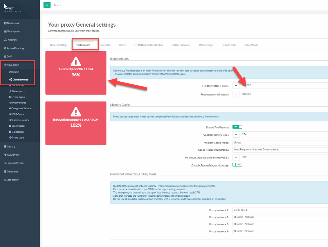 If it is the case, modify values in the Filedescriptors ( proxy ) and Filedescriptors (system ) field. Filedescriptors (system ) must always be higuer or same value than Filedescriptors ( proxy )