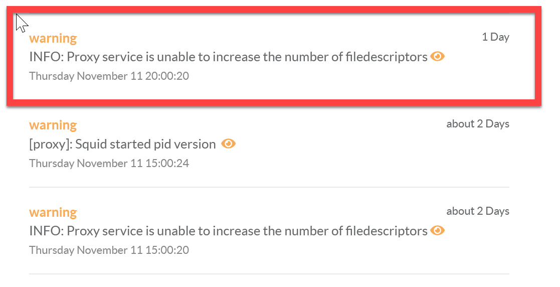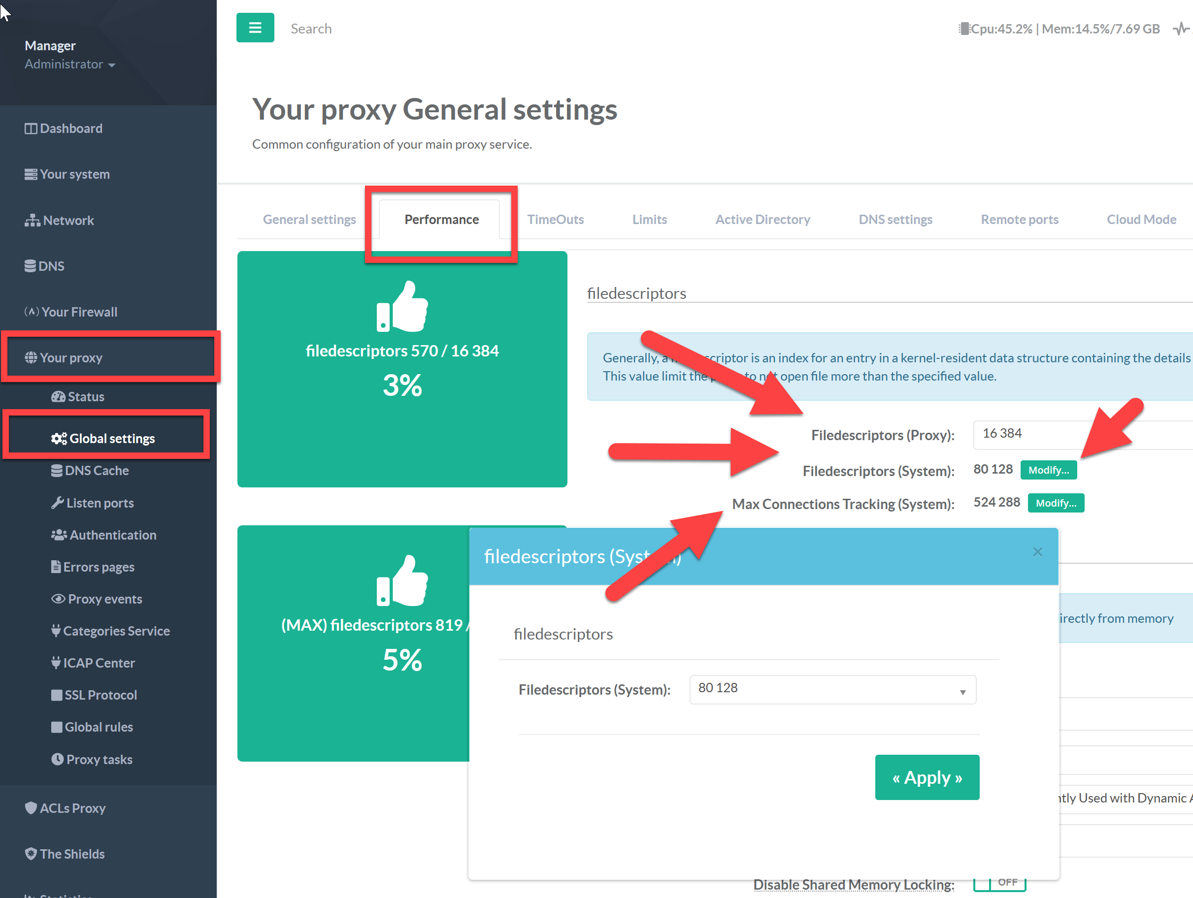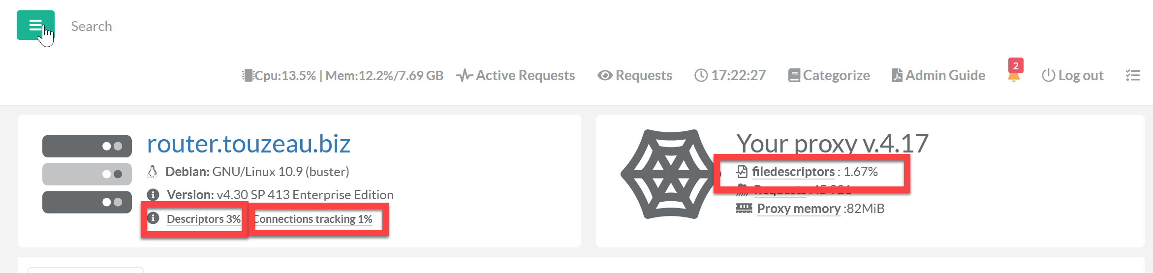 In some cases and depending on the load of the Internet service, you may encounter problems such as "INFO: The proxy service is unable to increase the number of filedescriptors".