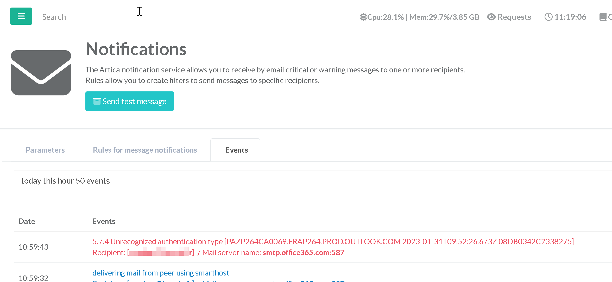 You receive the following error 5.7.4 Unrecognized authentication type on Office365.To fix it, you must use the Artica v4.40 Service Pack 58 or above