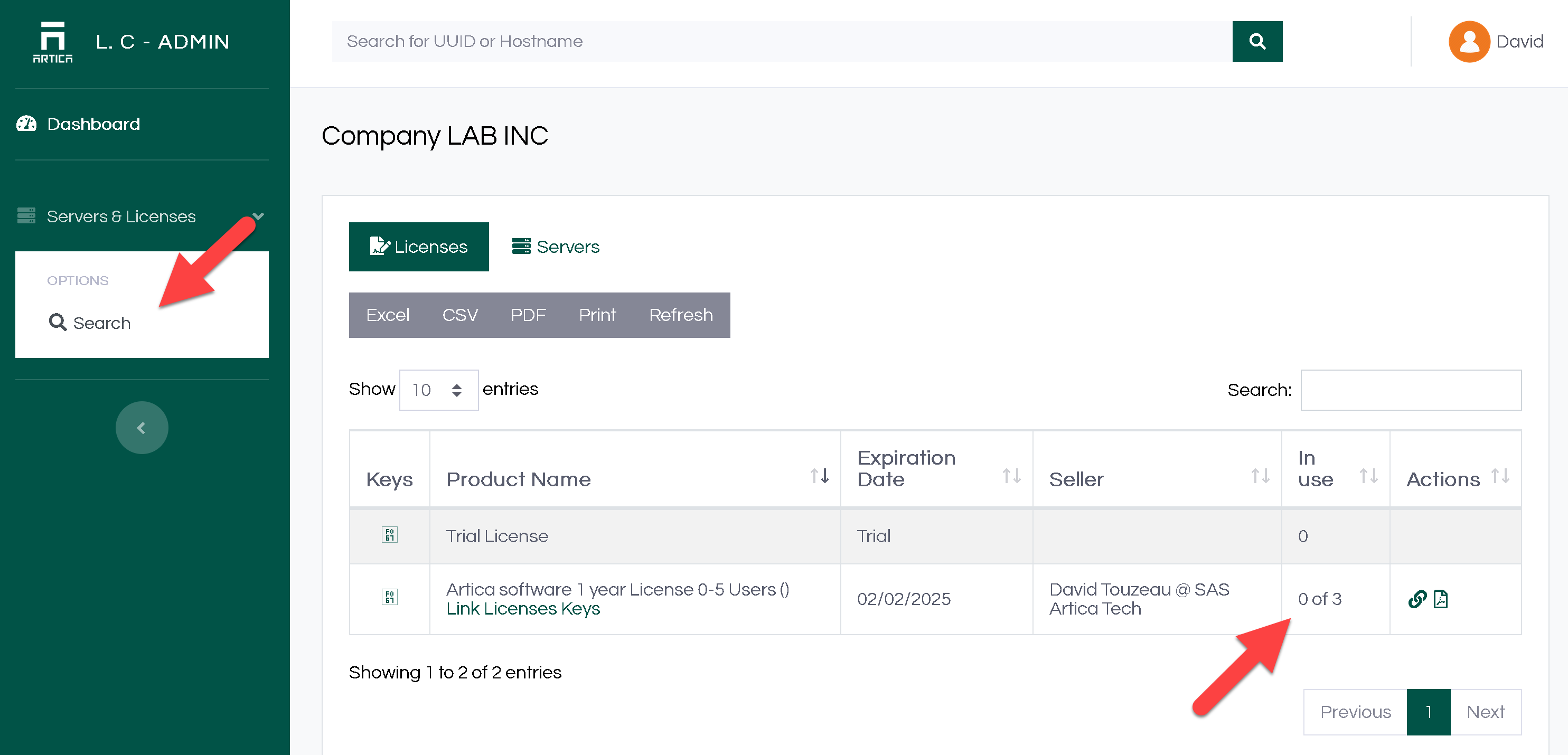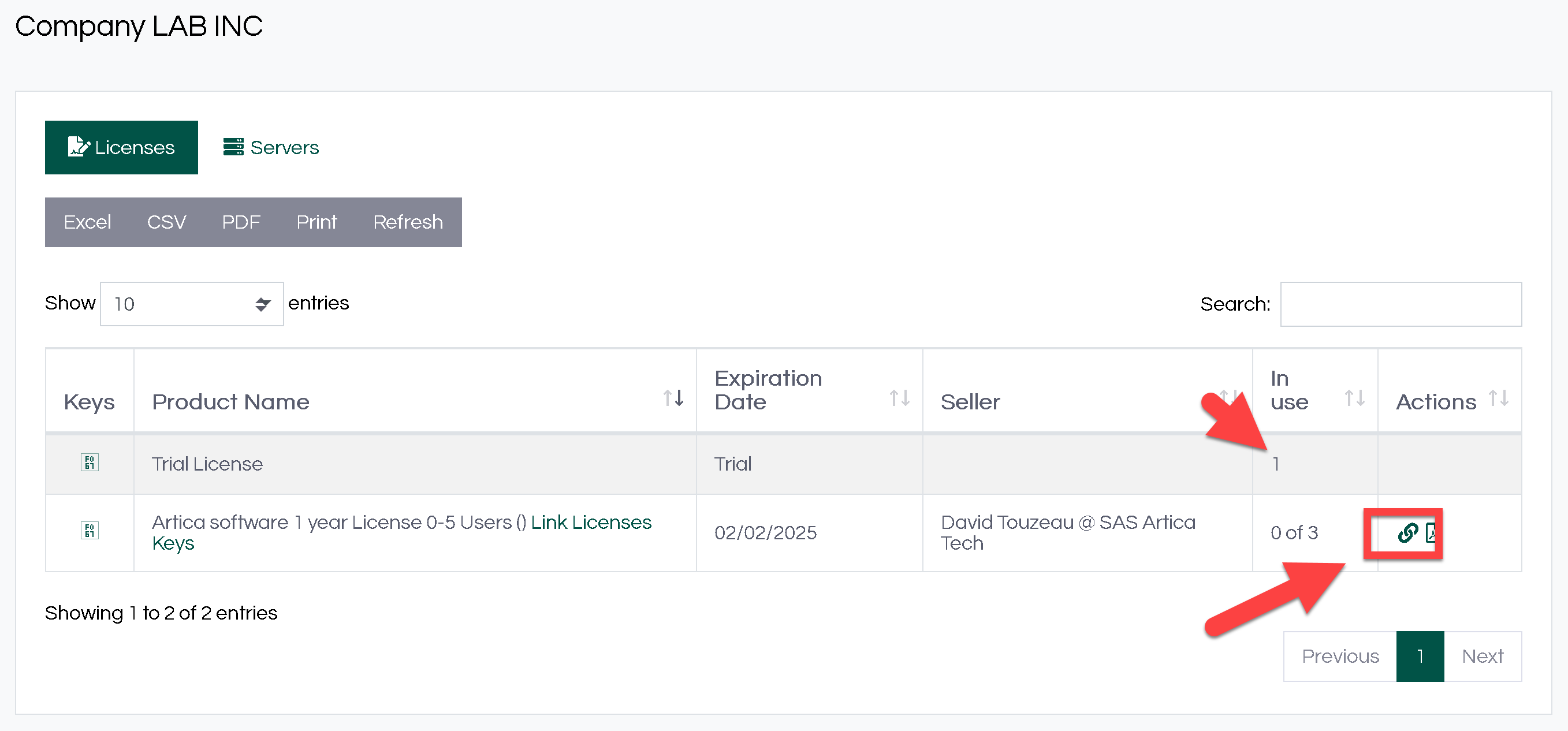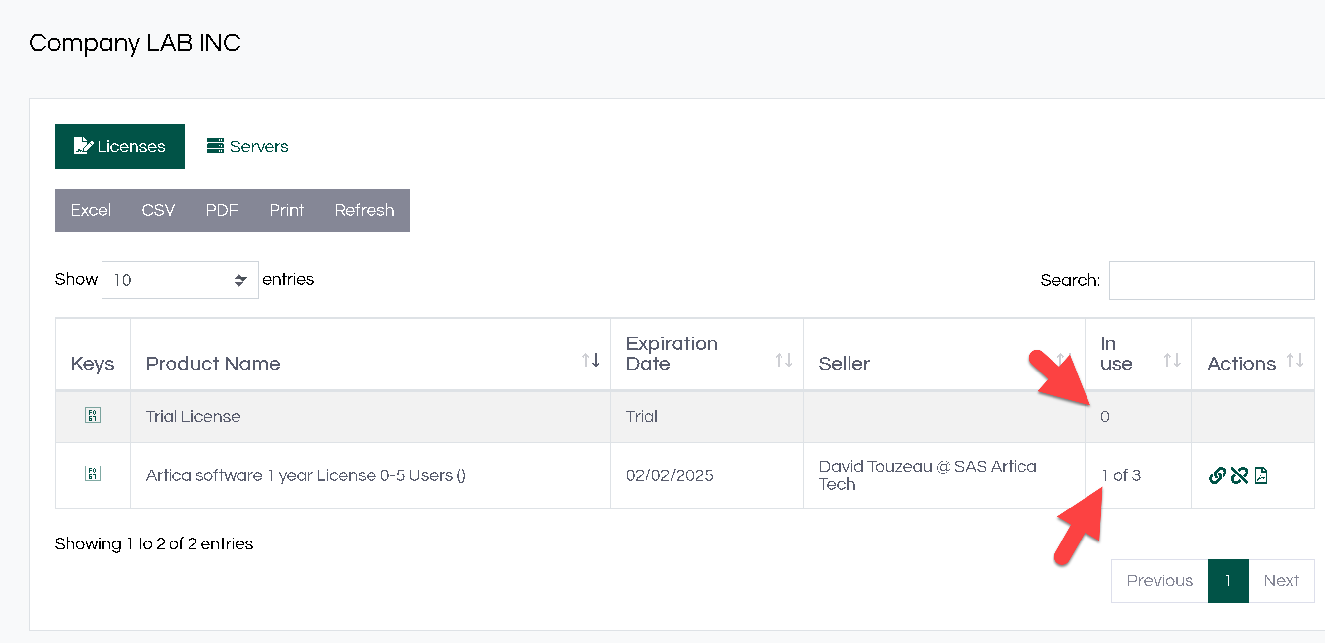Most important is the “In use” column that display the number of Artica allowed to this license and the number of Artica servers linked to this License.