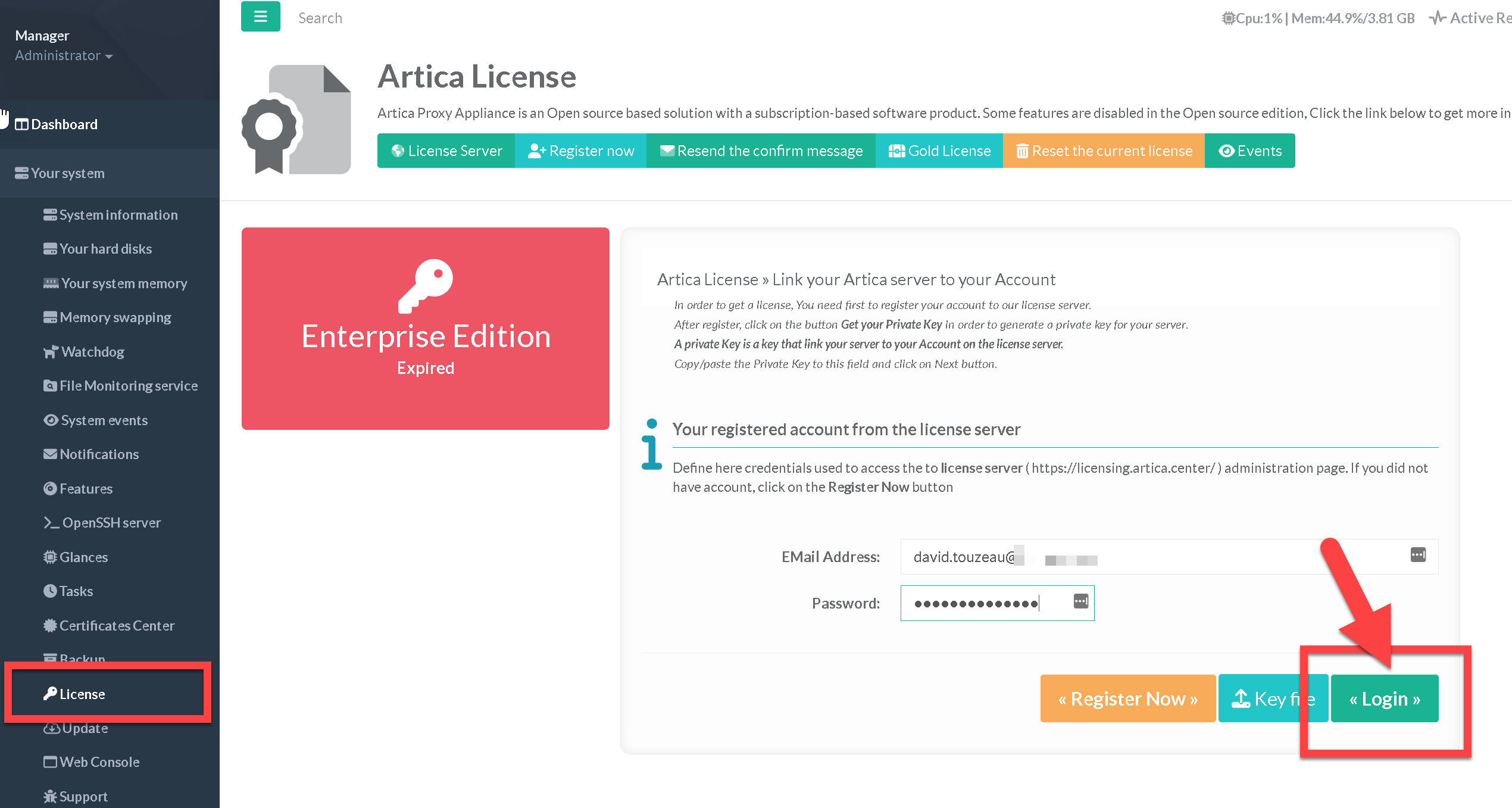 If you don't have the Login button, this probably means that your Artica server is in automatic evaluation mode. To do this, use the "Reset the current license" button to access this form.