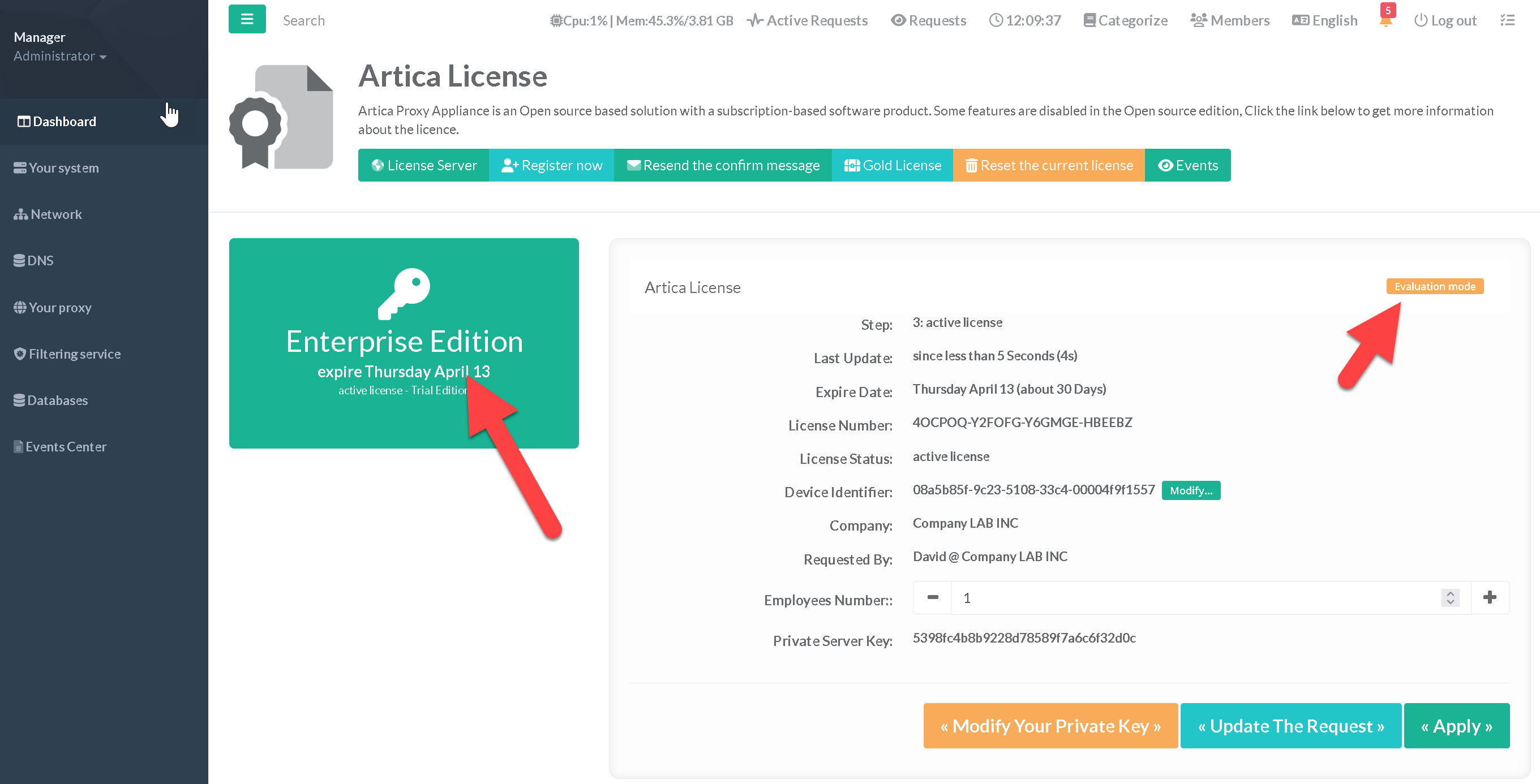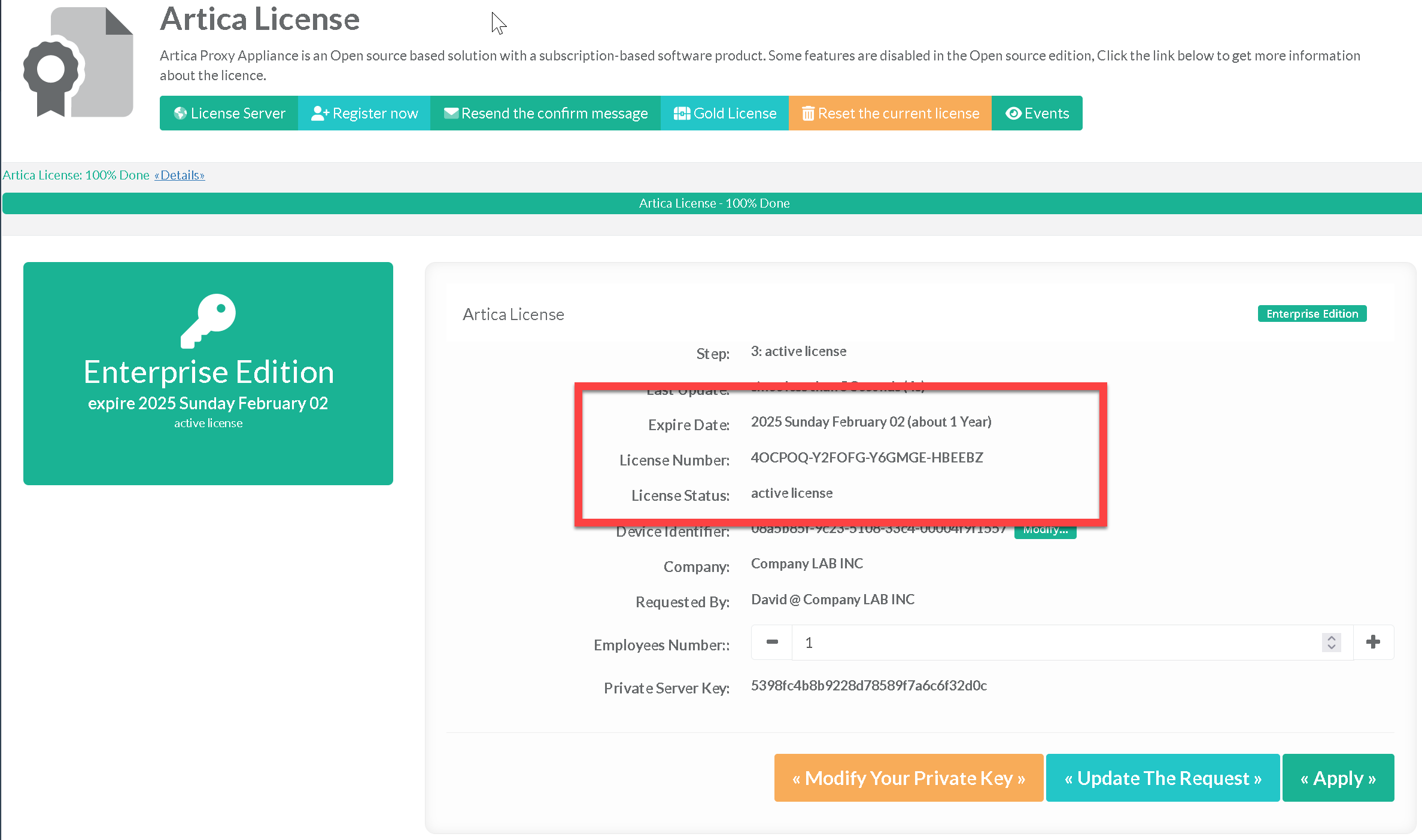 After clicking on the “Update the Request” button, you should see your Artica server with the new license.