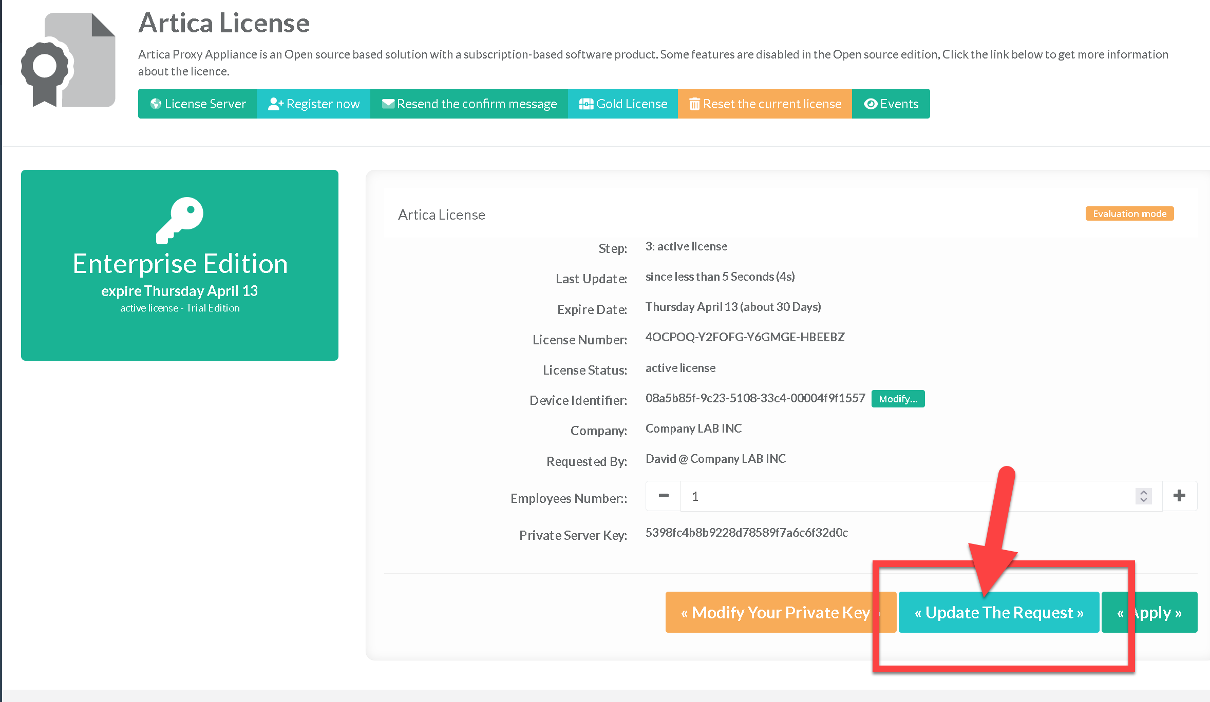 On the Artica server, inside the license section, click on Update the Request (This operation is not mandatory because Artica periodically requests the license server and updates itself if necessary)