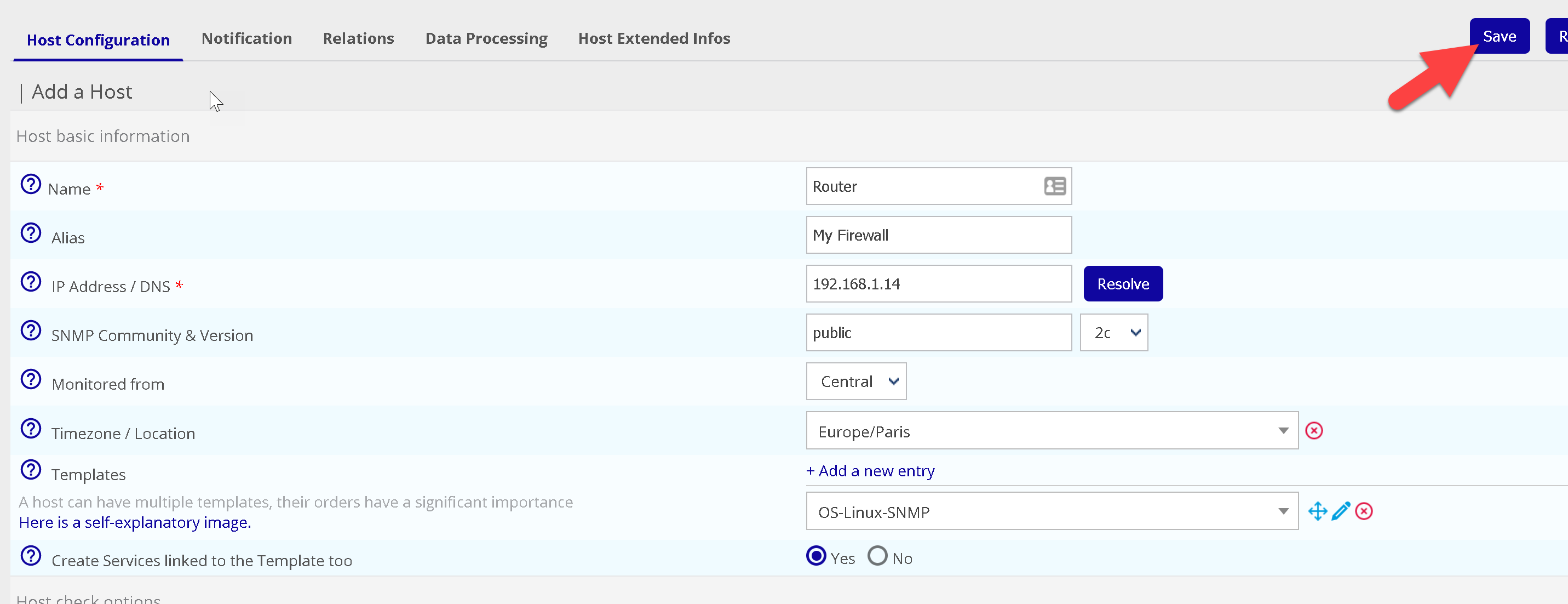 Name of your monitored Artica serverP address of your Artica server in “IP adresse/DNS”public and SNMP version as 2ctemplate OS-Linux-SNMP-custom