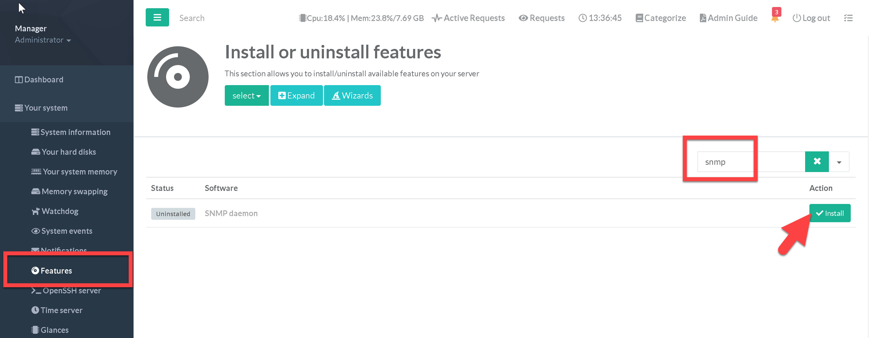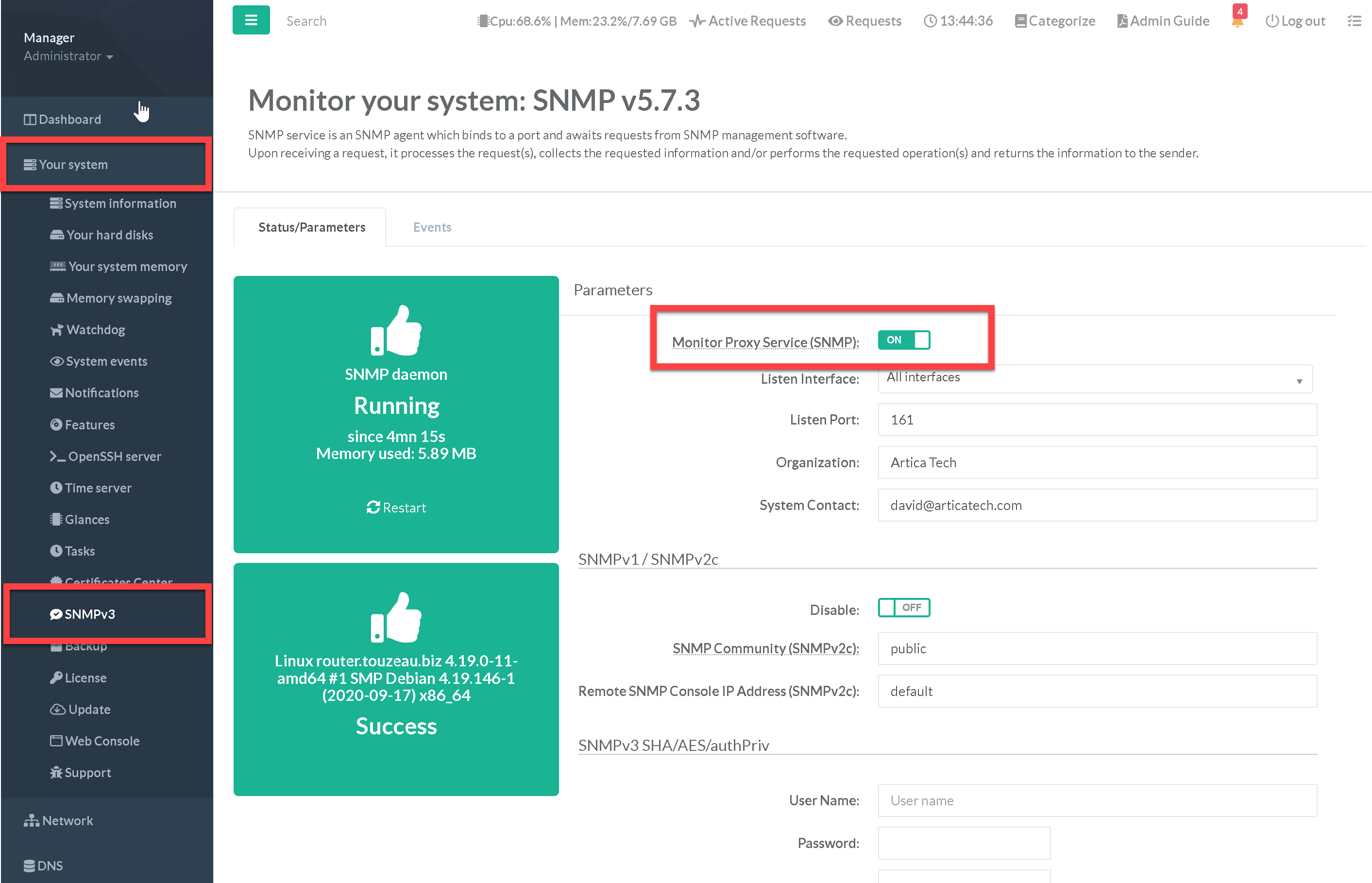 After installed, the web interface add a new menu item SNMPv3 under “Your System” main section.