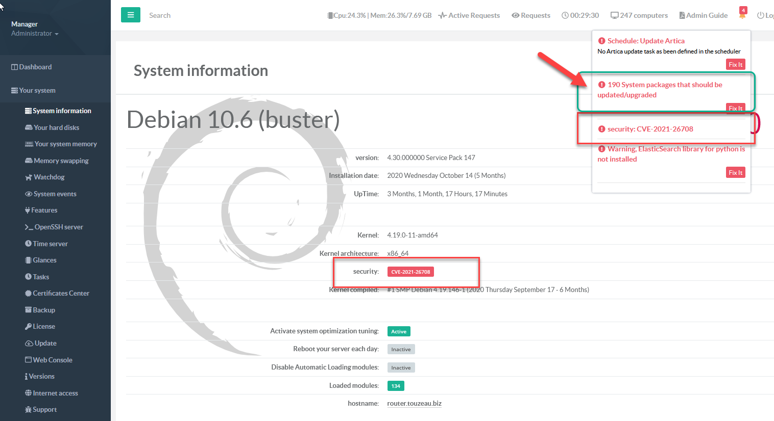 The Web Artica console notify that your system must be updated in order to fix this security hole. ( Artica v4.30 SP 151 or above)