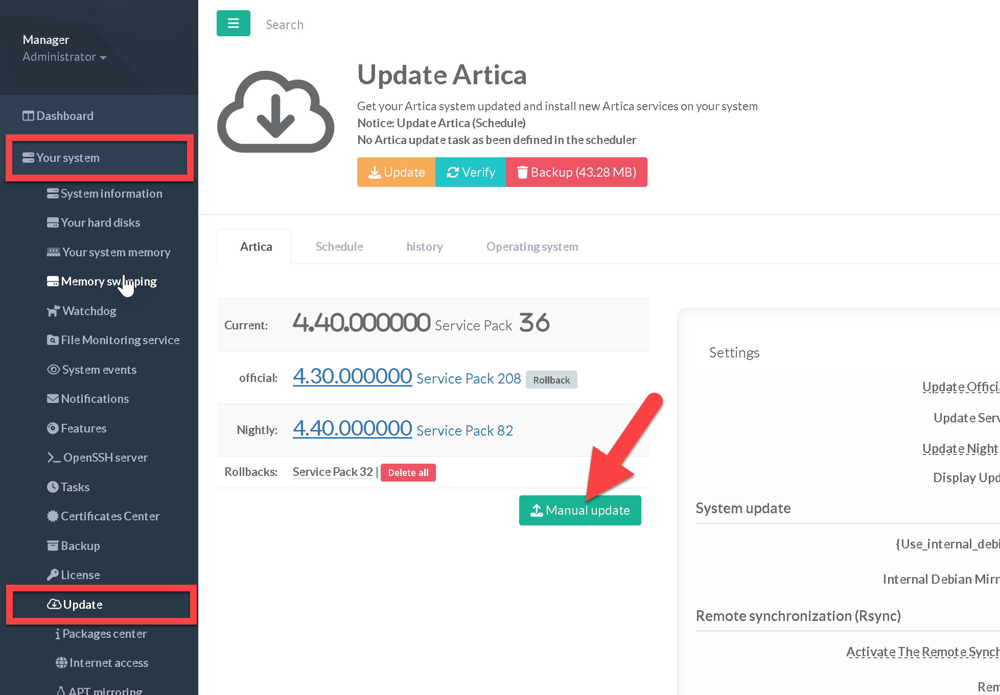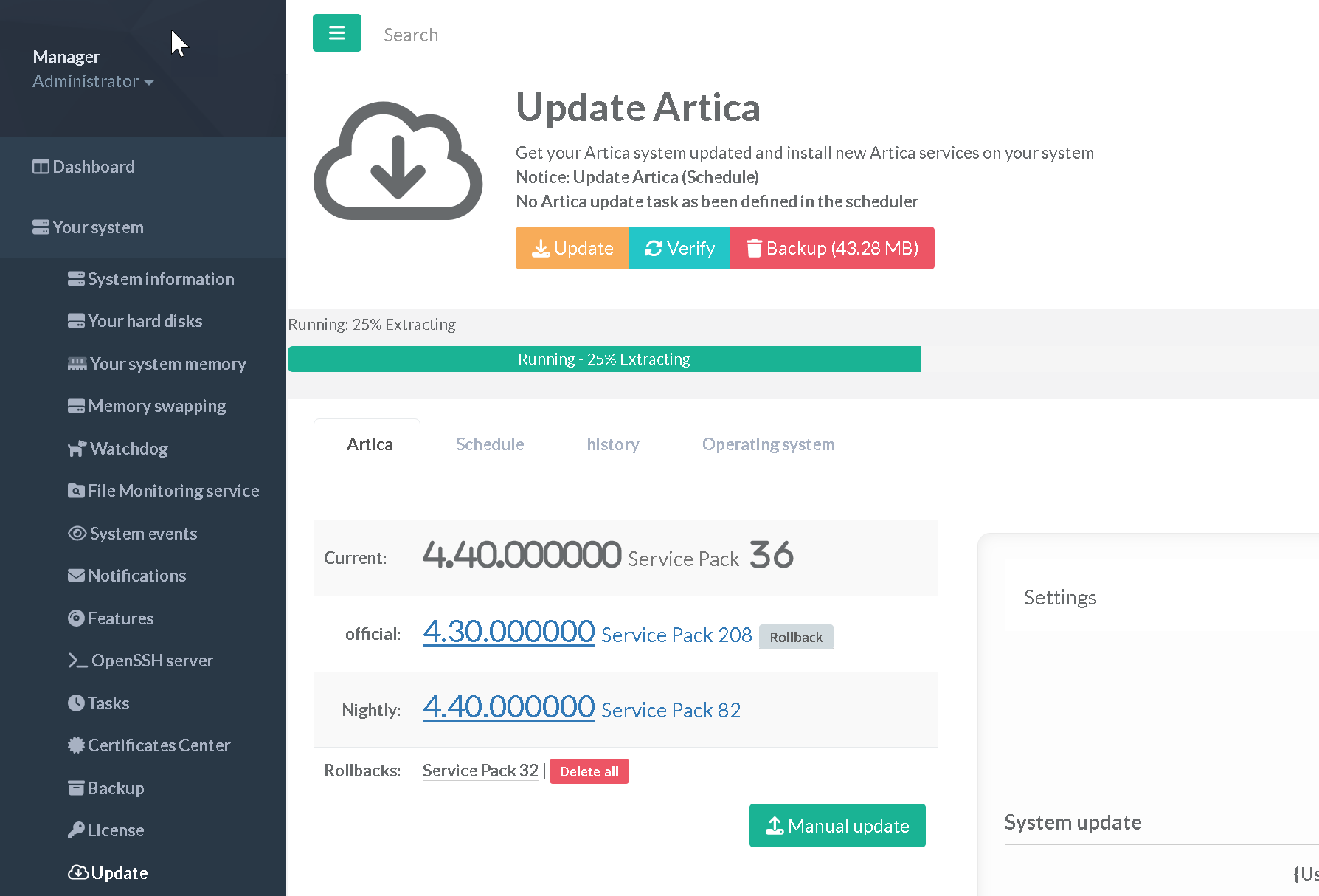 Occasionally the progress bar may freeze. This can be normal because sometimes the console service is restarted. You don't need to wait for 100% to continue managing Artica.