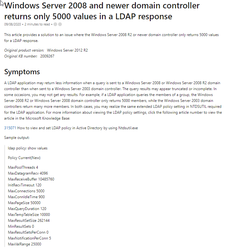 This article provides a solution to an issue where the Windows Server 2008 R2 or newer domain controller only returns 5000 values for a LDAP response.