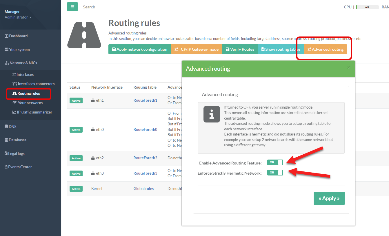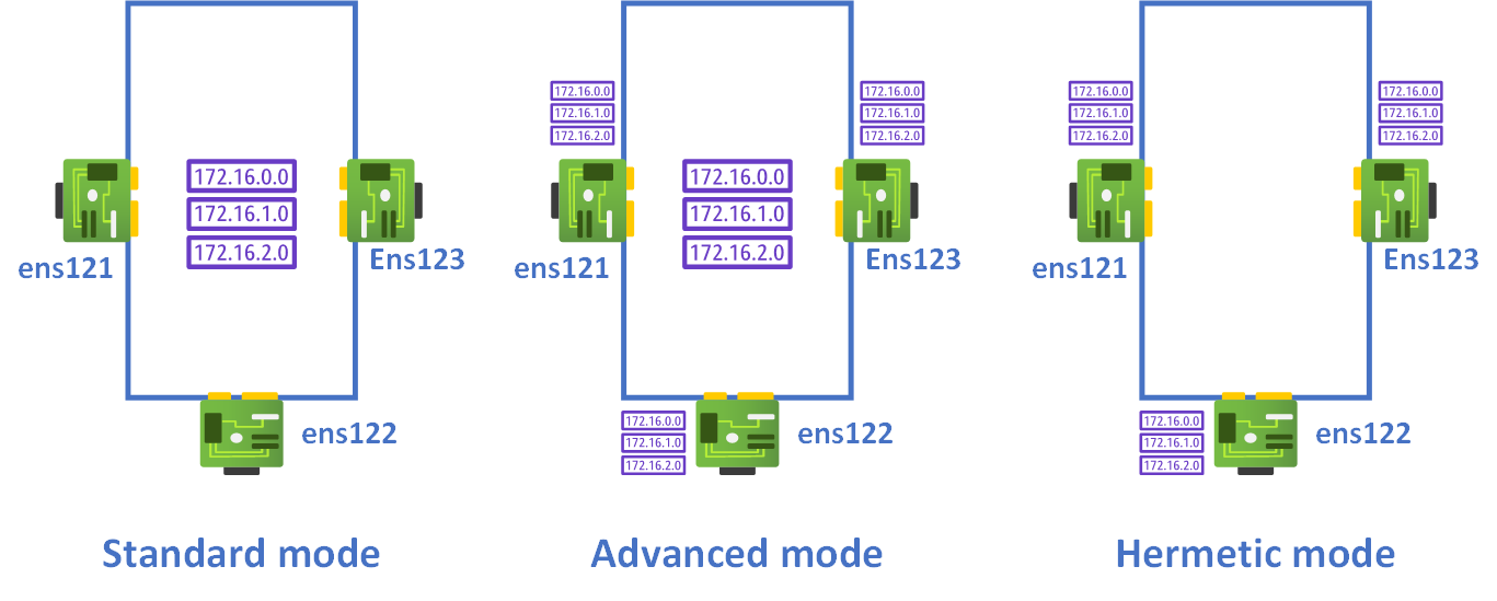 In this mode, the central routing table is empty, and each network card only knows the networks assigned to it, without knowledge of the other networks on different network cards (unless specified in the routing rules). This is why it is called “hermetic” , as no card can communicate with the others.