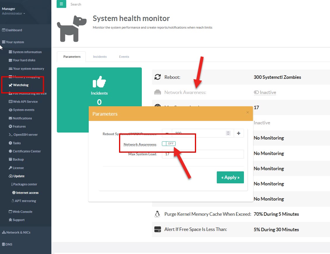 Your system” > “Watchdog”Network Awarness” link and enable the Network Awarness option
