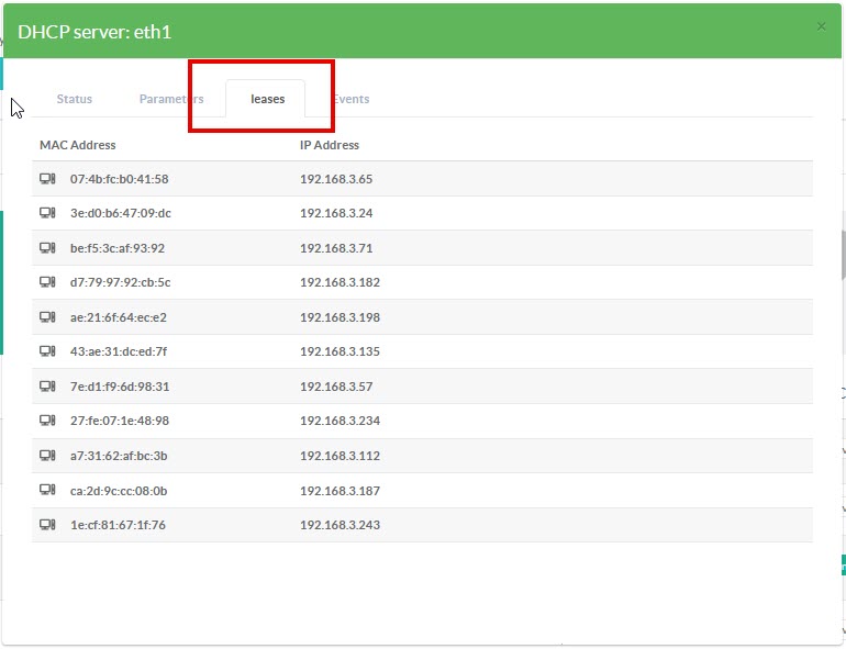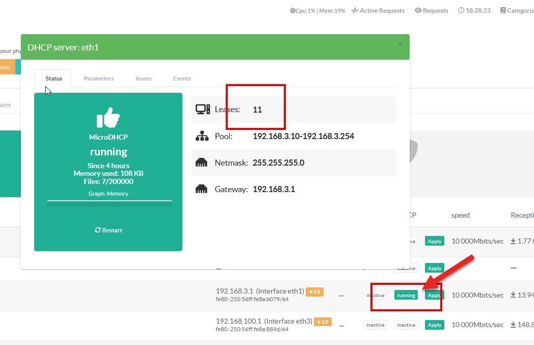 - When clicking on the “Running” status under network configuration the first tab shows you the status of the service and the number of provided leases.