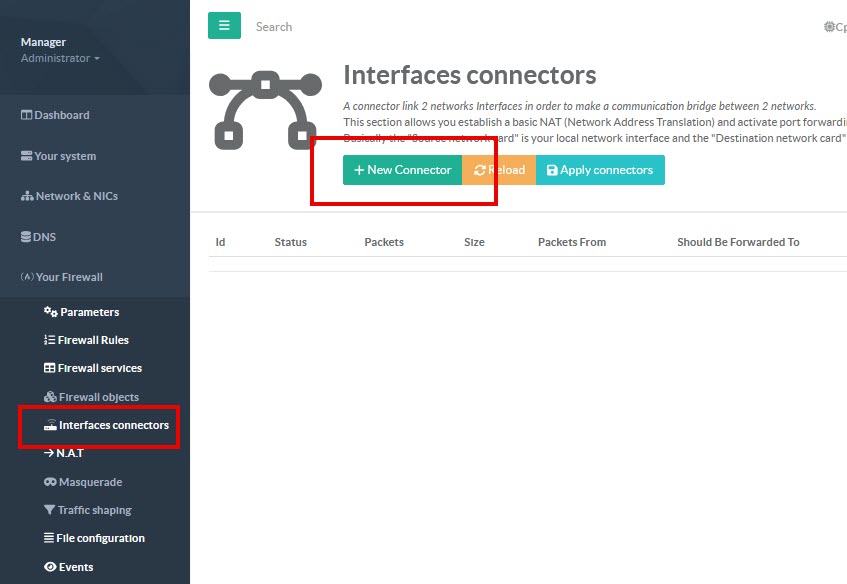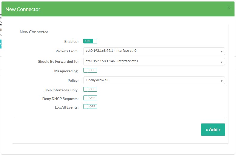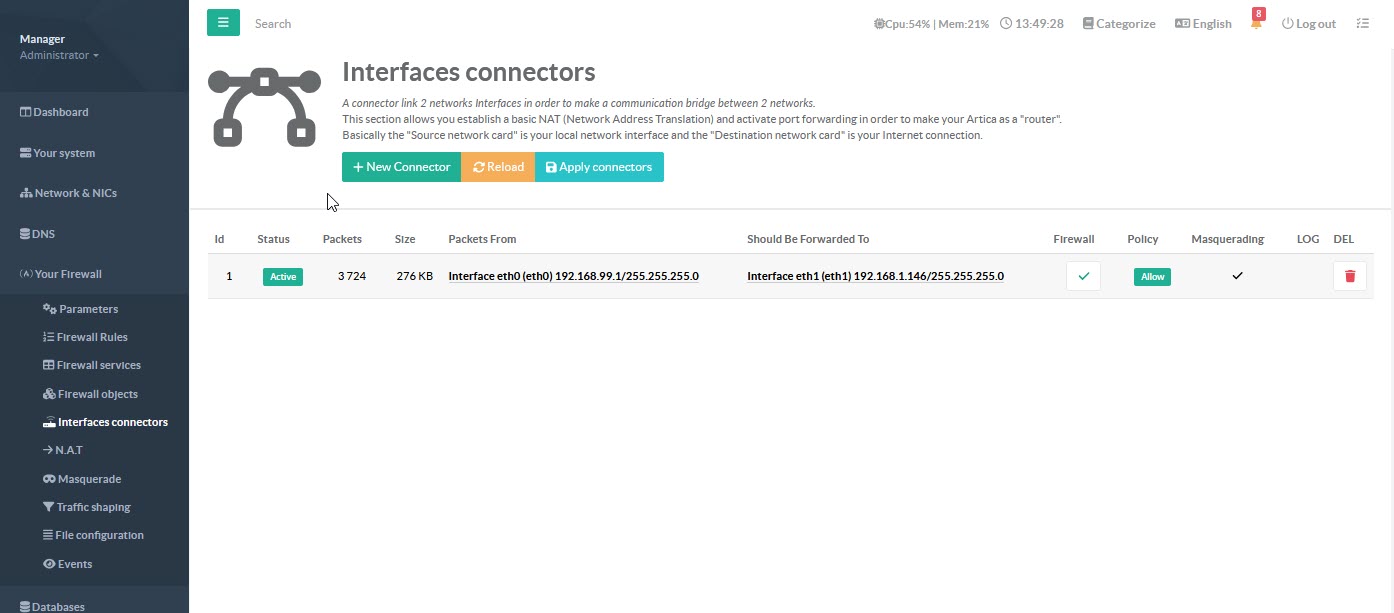 A connector link 2 networks Interfaces in order to make a communication bridge between 2 networks. This section allows you establish a basic NAT (Network Address Translation) and activate port forwarding in order to make your Artica as a "router". Basically the "Source network card" is your local network interface and the "Destination network card" is your Internet connection.