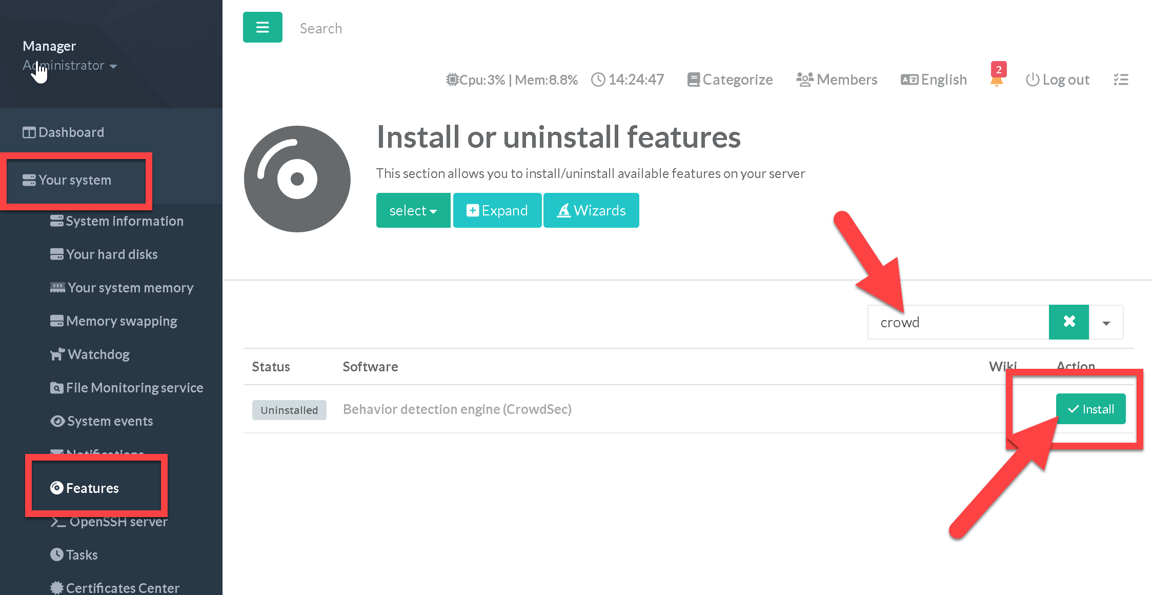 Once the CrowdSec package is installed you are able to install the CrowdSec feature.