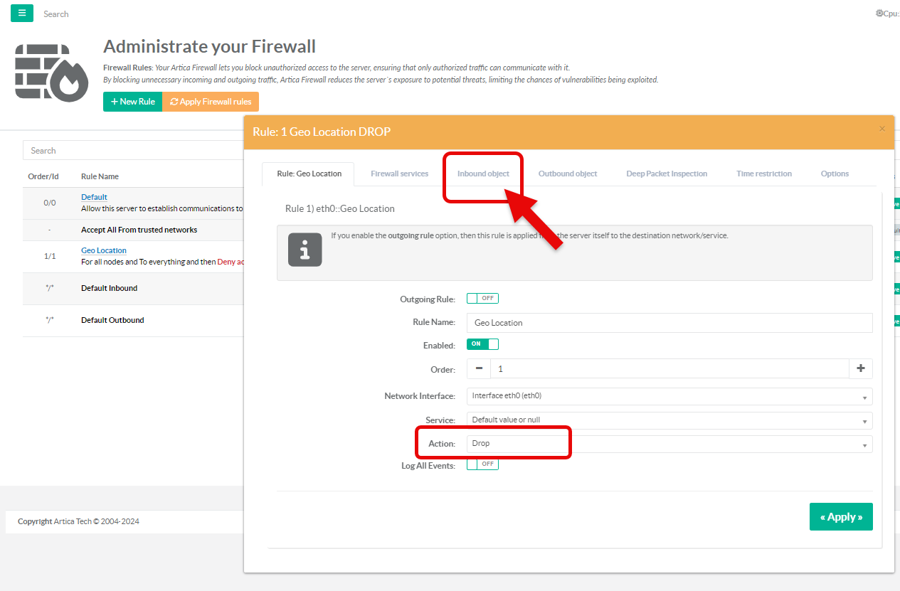 geoip locationobject in Firewall provides a robust, flexible, and cost-effective method to control network traffic based on geographic information, enhancing security, compliance, and performance.This feature is available on Artica v4.50 Service pack 1 or Artica v4.50 Hotfix 20241110-21